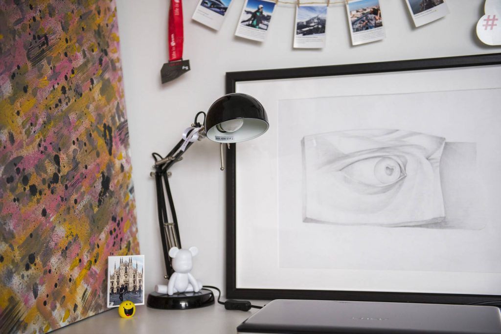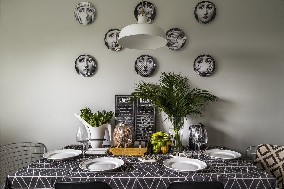 Insertiile de gri si negru sunt bine dozate, iar decoratiunile precum ceramica Fornasetti de pe peretele cu masa isi aveau locul stabilit inca dinainte de orice proces de amenajare. De altfel, atentia Yuliei pentru detalii o regasim in fiecare colt al casei. Motivele geometrice precum si nuantele isi au corespondentul in fiecare spatiu, amenajarea urmand astfel un fir coerent si unitar.