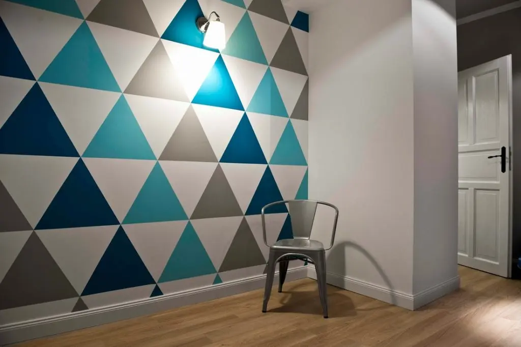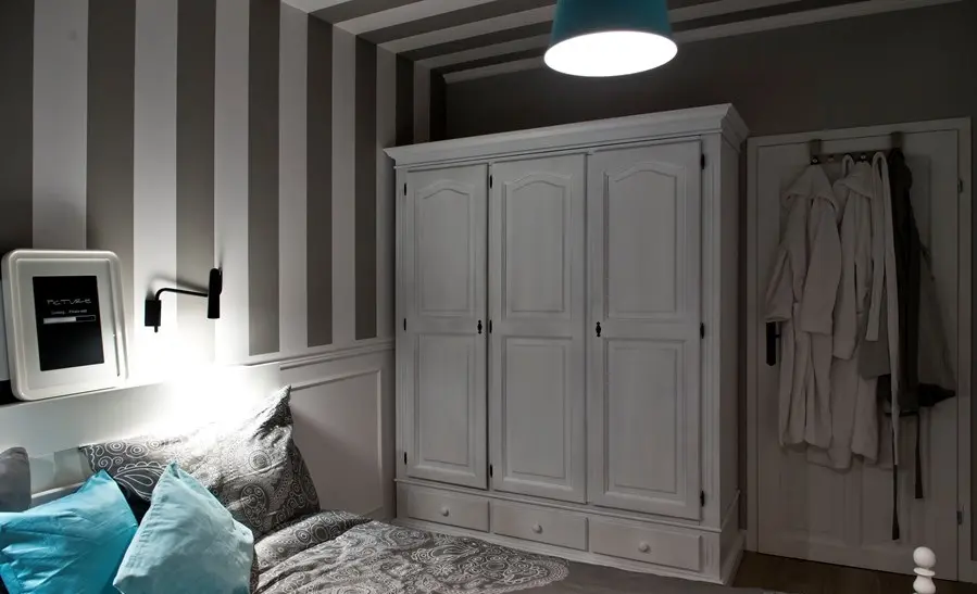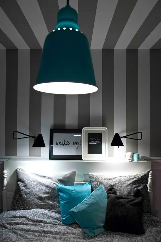 In dormitor, designerii au ales sa contureze o zona-accent in jurul patului , trasand dungi ce urca pana in tavan. Griul si albastrulfac o casa buna impreuna in acest spatiu de inspiratie nordica, iar dulapul pentru haine vine cu un design rustic-modern.