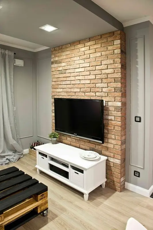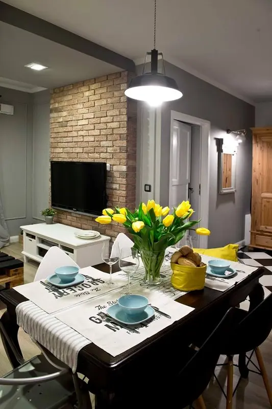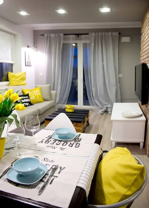 Spatiul apartamentului de 2 camere este impartit in zona de zi cu living, dining, bucatarie si mai apoi dormitor cu baie. Camera de zi este zona principala a acestei locuinte prin cele 3 functiuni pe care le reuneste. Fiecare din ele este amenajata cu mobilier sumar, lasand spatiul aerisit si luminos in ansamblul sau. Decoratiunile si finisajele personalizeaza fiecare zona in parte. Placarea cu caramida pentru a crea un perete-accent, masuta de cafea realizata dintr-un palet si vopsita ulterior, accentele de galben pe un fundal preponderent neutru, iata doar cateva elemente care descriu o amenajare cu stil.