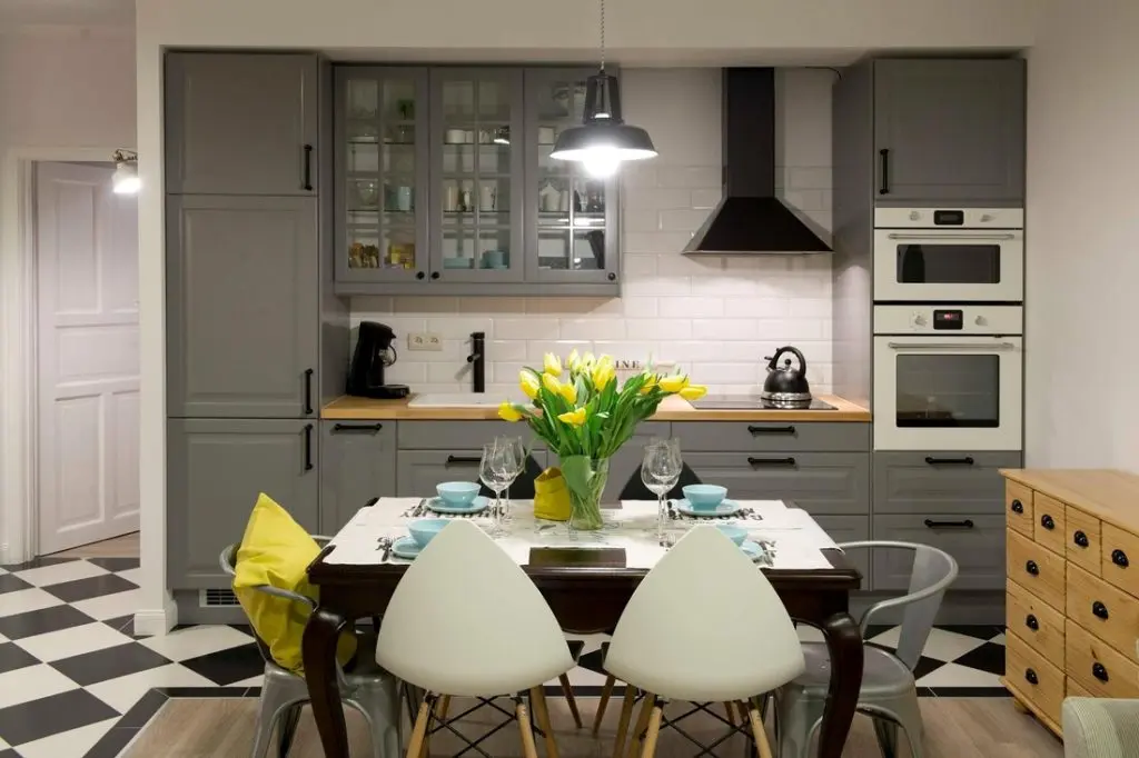 Bucataria este tipic scandinava, cu fronturi gri si accente de negru. Dispunerea compacta, liniara este potrivita unei amenajari in plan deschis. Electrocasnicele incorporate in mobilier imprima un aer ordonat, unitar. Atat in bucatarie cat si in restul holului, pardoseala este un model clasic, tip tabla de sah. Pentru zona centrala a camerei aferenta diningului si livingului s-a optat pentru parchet. Avem astfel o delimitare discreta intre functiuni.