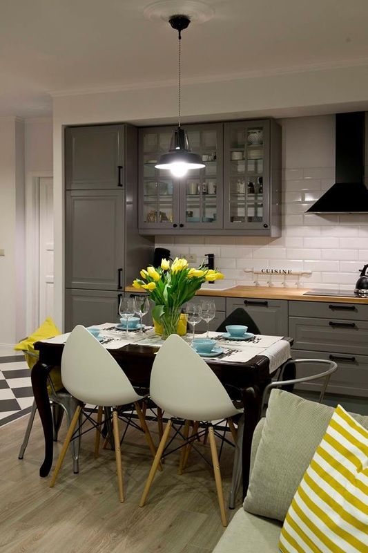 Bucataria este tipic scandinava, cu fronturi gri si accente de negru. Dispunerea compacta, liniara este potrivita unei amenajari in plan deschis. Electrocasnicele incorporate in mobilier imprima un aer ordonat, unitar. Atat in bucatarie cat si in restul holului, pardoseala este un model clasic, tip tabla de sah. Pentru zona centrala a camerei aferenta diningului si livingului s-a optat pentru parchet. Avem astfel o delimitare discreta intre functiuni.