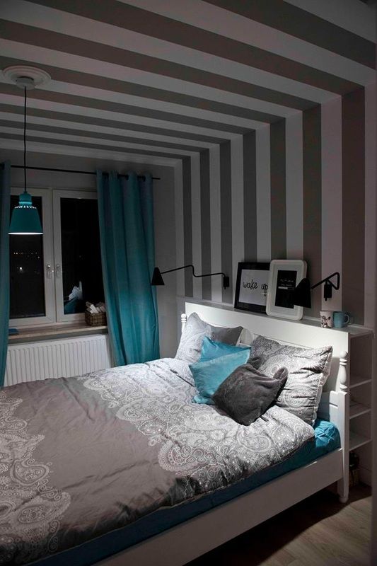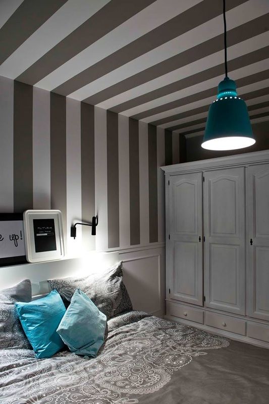 In dormitor, designerii au ales sa contureze o zona-accent in jurul patului , trasand dungi ce urca pana in tavan. Griul si albastrulfac o casa buna impreuna in acest spatiu de inspiratie nordica, iar dulapul pentru haine vine cu un design rustic-modern.