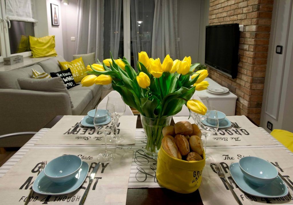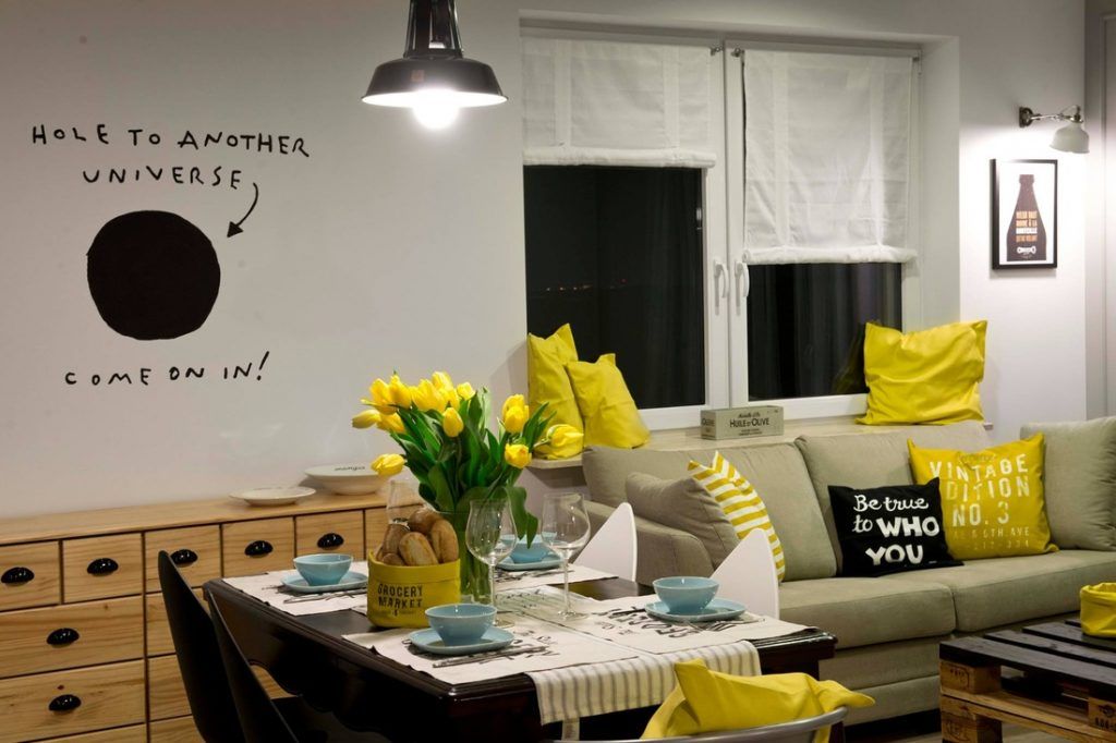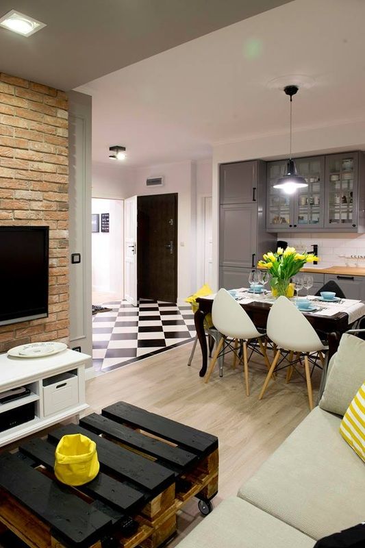 Spatiul apartamentului de 2 camere este impartit in zona de zi cu living, dining, bucatarie si mai apoi dormitor cu baie. Camera de zi este zona principala a acestei locuinte prin cele 3 functiuni pe care le reuneste. Fiecare din ele este amenajata cu mobilier sumar, lasand spatiul aerisit si luminos in ansamblul sau. Decoratiunile si finisajele personalizeaza fiecare zona in parte. Placarea cu caramida pentru a crea un perete-accent, masuta de cafea realizata dintr-un palet si vopsita ulterior, accentele de galben pe un fundal preponderent neutru, iata doar cateva elemente care descriu o amenajare cu stil.