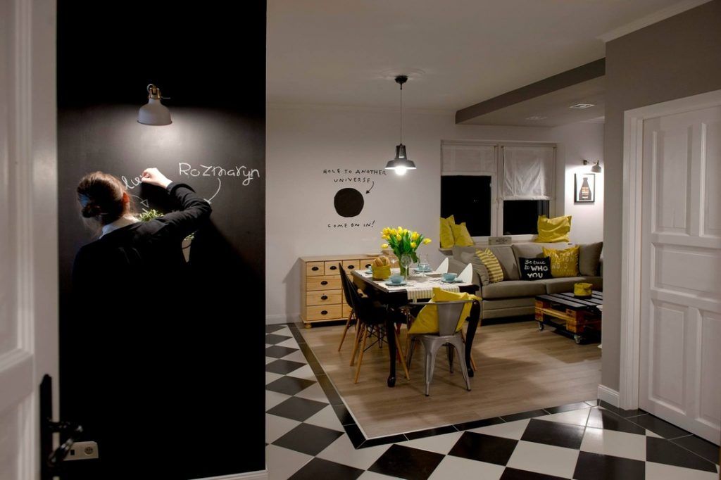 Iluminatul artificial joaca un rol important in aceasta amenajare. De la cel general, pana la cel ambiental sau direct, toate se imbina pentru ca fiecare sector al locuintei sa aibe parte de lumina potrivita. Corpurile suspendate, spoturile cu L ED incastrate in plafonsau lampile folosite pentru a pune in evidenta tablourile si peretele cu vopsea neagra tip tabla scolara sunt bine alese.