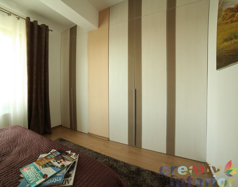 Finisajul dressingului din dormitor este din lemn alb cu insertie de fasii din sticla de culoare cappuccino. Patul are o tapiserie care a plecat de la ideea de patchwork, unde s-au utilizat mai multe tipuri de textile, pastrand in acelasi timp textilul din draperie pentru continuitate in design.