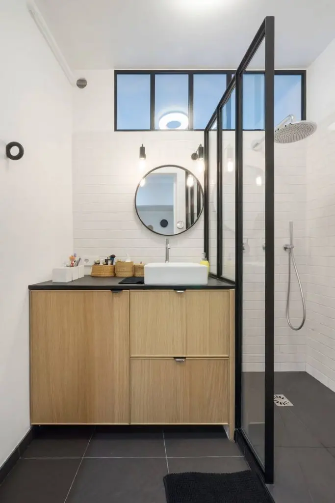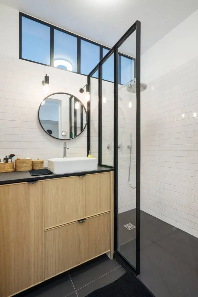 Pentru ca lumina naturala sa patrunda si in baie, in partea superioara a peretelui dintre cele doua incaperi a fost inserata o fereastra interioara. Optimizarea este cuvantul de baza si in perimetrul baii, unde a fost integrata o zona de depozitare imediat sub lavoar si amenajat un dus tip walk-in; structura metalica tip glasvand preia modelul ferestrei mai sus mentionata.