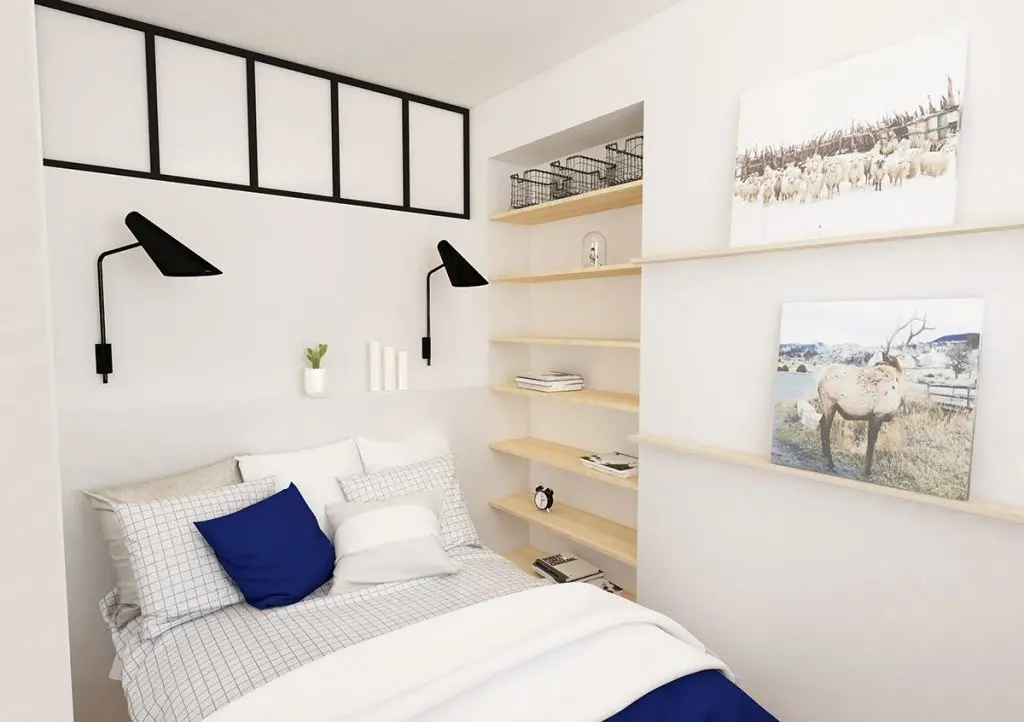 Cele doua dormitoare sunt absolut minimal tratate si amenajate cu strictul necesar. In camera copilului au fost integrate corpuri de mobilier pentru o depozitare variata si un mic birou, dar dormitorul cel mic al parintilor se limiteaza doar la un pat si polite incastrate intr-o nisa.