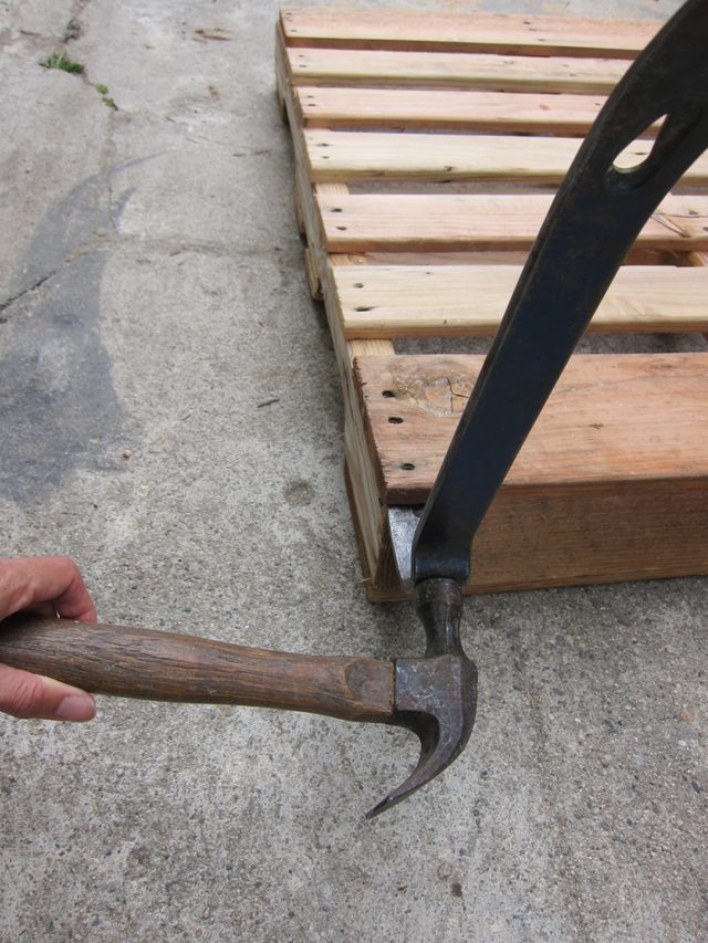 Folosind ranga si ciocanul dezmembreaza cu grija paletul, incercand sa nu deteriorezi scandurile;