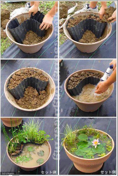 Acum ca ai grilajul din ghiveci bine fixat, iar pamantul este gata pentru plante, poti incepe sa torni apa in partea mai mare, pana se umple si astfel vei avea un mix iaz, chiar la tine in vas.