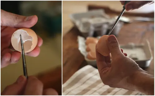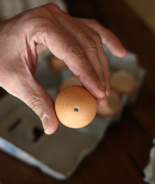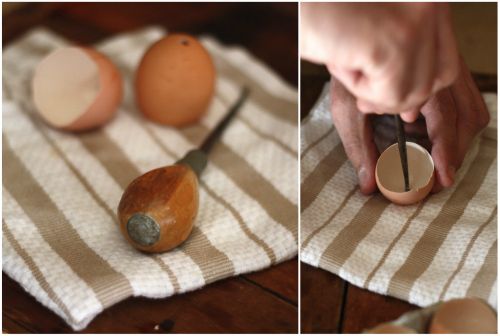 3. Odata fierte cojile, urmeaza sa le pui in cartonul de oua dupa care sa le faci cate o gaura mica, chiar la baza, cu o surubelnita mica cu varf ascutit sau cu un ac mai gros. Mare atentie sa nu spargi coaja complet.