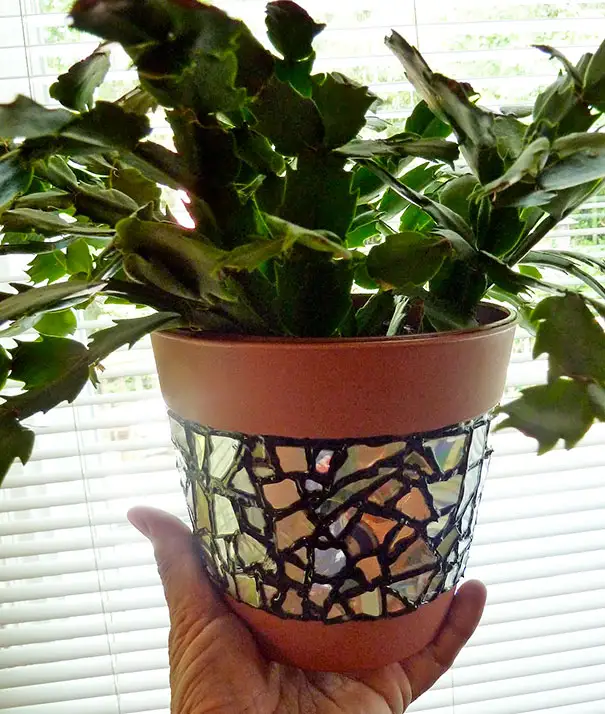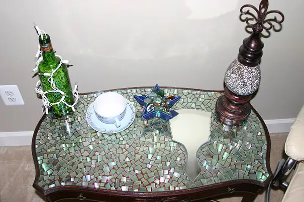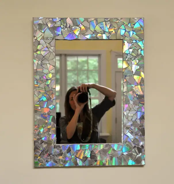 rama de oglinda decorata cu un mozaic din bucatele de CD.