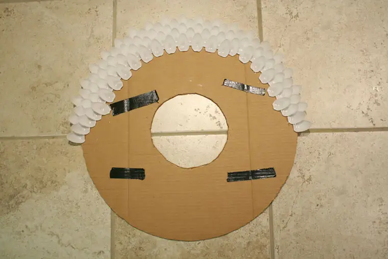 Pe spatele cercului, aplicati spre una din margini o bucata de sfaora care va forma un ochi. De acest ochi se va agata, de perete, viitoarea oglinda.