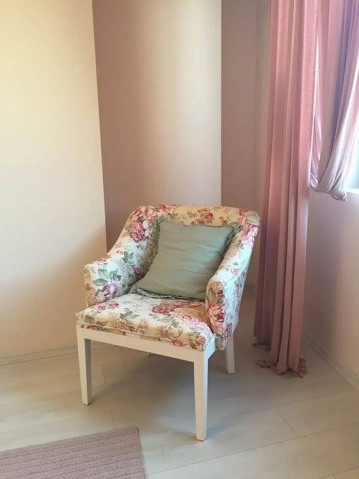 Incaperea nu este aglomerata, ceea ce este recomandat pentru un spatiu mic. Zona de langa fereastra a fost folosita ingenios pentru relaxare, unde au asezat doua scaune tapitate cu model floral.
