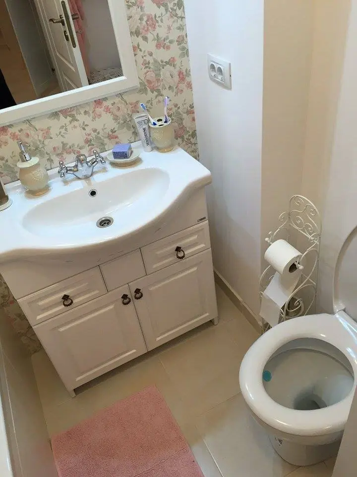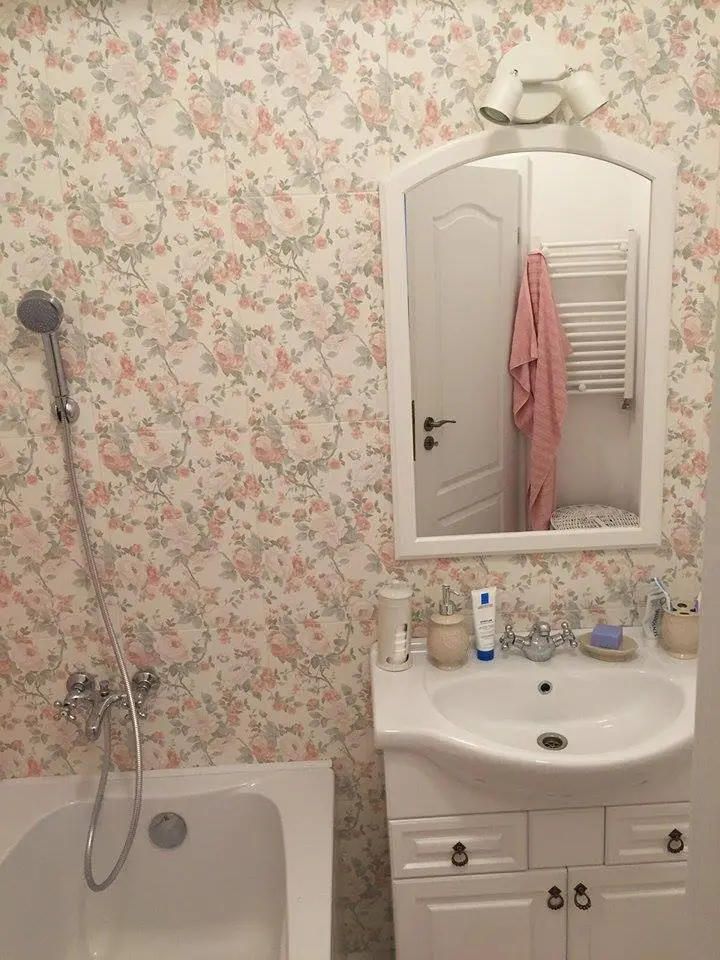 In baie, elementul vedeta este faianta cu motive florale de langa cada. In rest, s-au pastrat aceleasi nuante pastelate si deschise. Formele obiectelor sunt rotunjite, pastrand, astfel stilul romantic al intregului apartament.