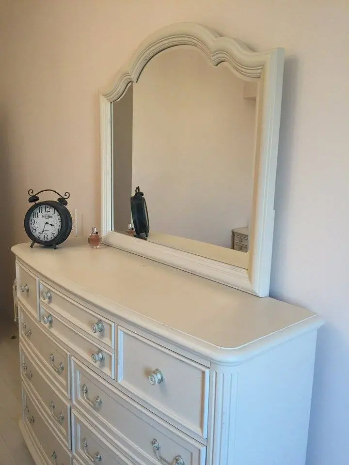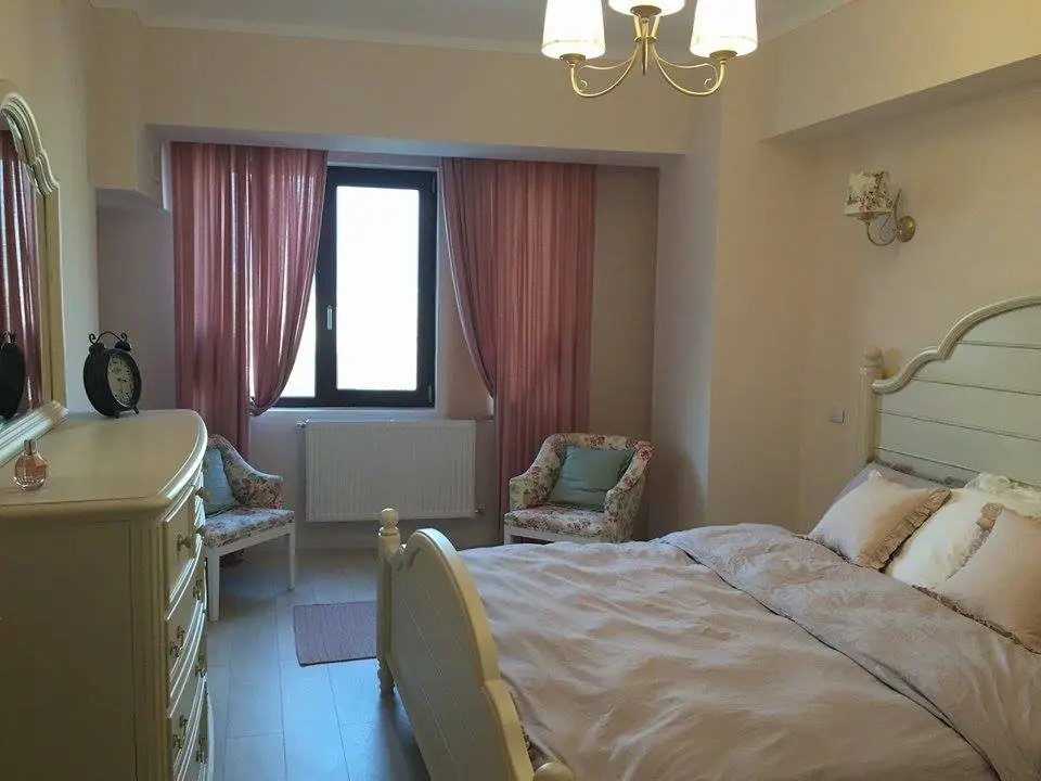 In dormitor se continua tonurile calde si romantice. Astfel, patul are o nuanta deschisa si forme ale cadrului rotunjite. Restul mobilierului a fost ales in aceeasi culoare, creandu-se astfel unitate. Ideea de spatialitate si dimensiune este data de oglinda si draperiile supradimensionate.