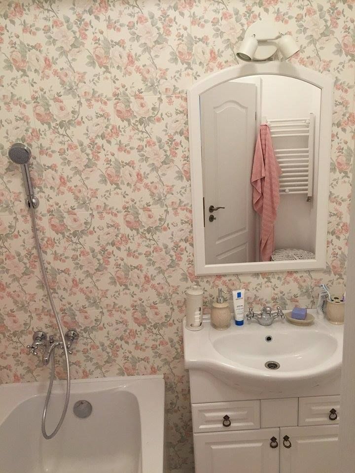 In baie, elementul vedeta este faianta cu motive florale de langa cada. In rest, s-au pastrat aceleasi nuante pastelate si deschise. Formele obiectelor sunt rotunjite, pastrand, astfel stilul romantic al intregului apartament.