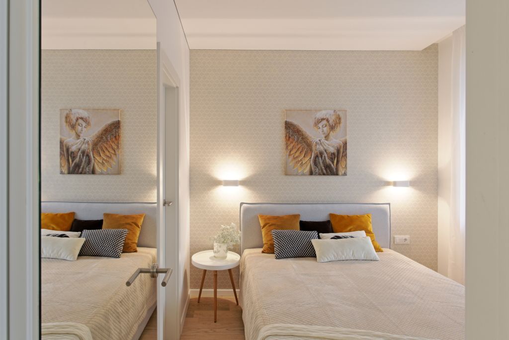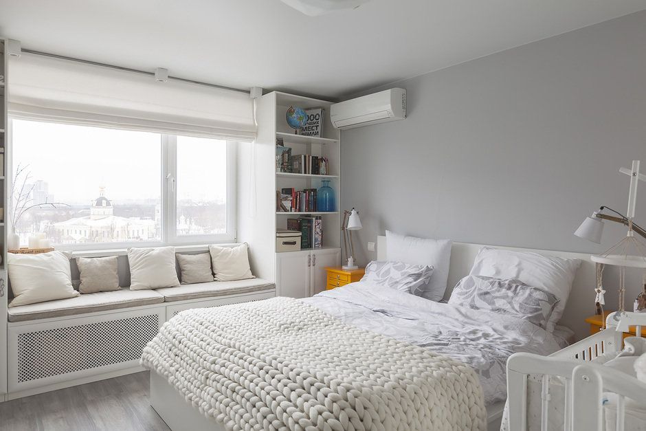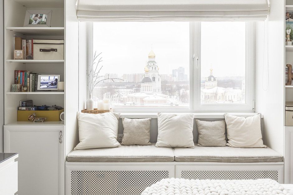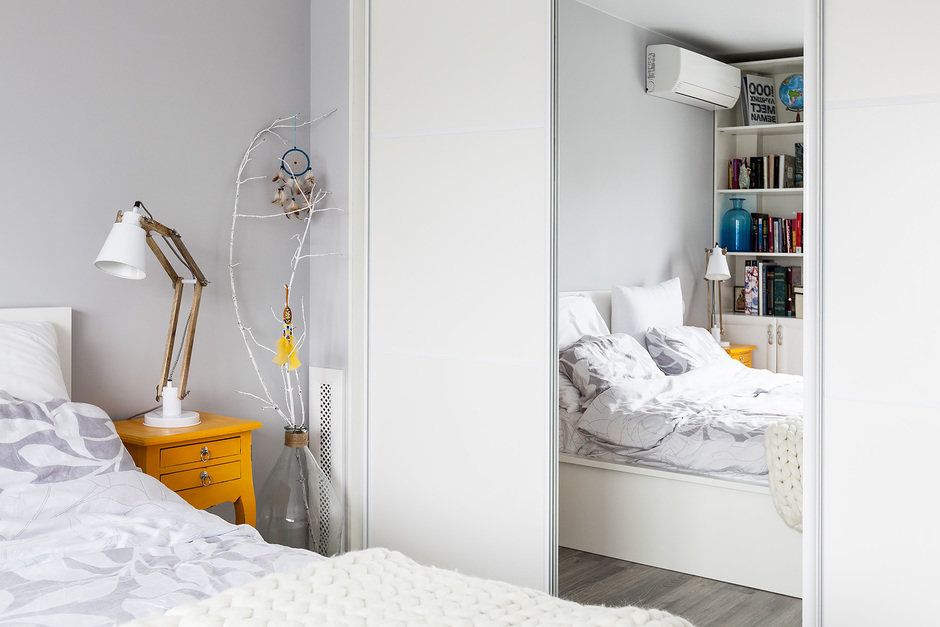 Dormitorul este o camera privilegiata prin prisma privelistii de care te poti bucura. De fapt, acesta a fost punctul de plecare in amenajare. Avand panorama in minte, au gandit aceasta dispunere cu banca sub fereastra, iar de o parte si cealalta au integrat doua corpuri de depozitare. Toate piesele sunt albe, inclusiv mastile de calorifer sau draperia in stil roman. Petele de culoare vin de la noptierele galbene si decoratiunile din interior. Din fericire, spatiul le-a permis sa integreze si un dressing pentru haine.