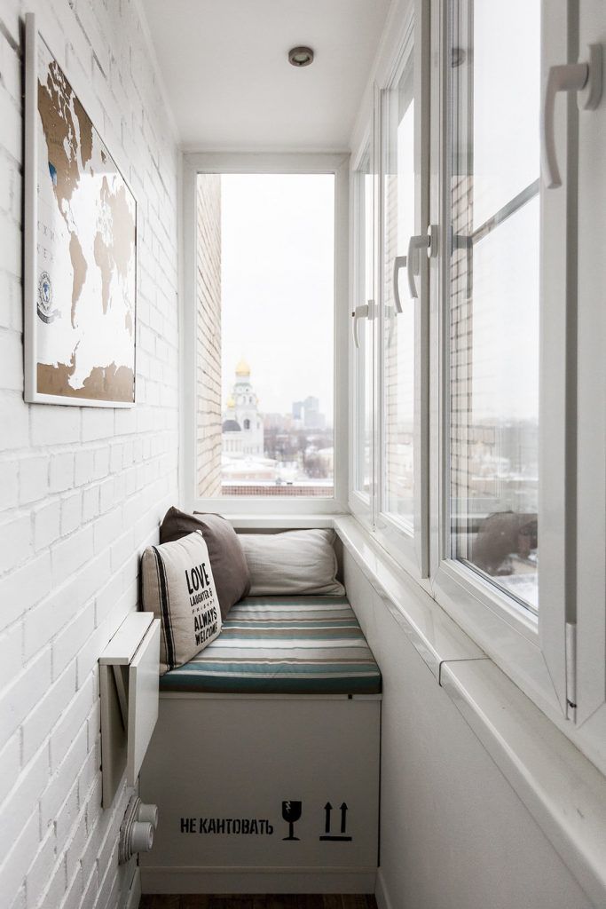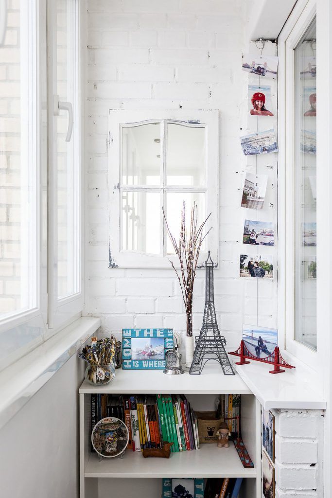 Ne place cum au reusit sa valorifice fiecare zona din apartament. Balconul, desi foarte mic, este un spatiu excelent de relaxare. Au vopsit caramida aparenta cu alb, iar pe un perete au adaugat o oglinda cu rama de fereastra – un truc excelent pentru a reflecta lumina si a crea iluzia de mai mult spatiu! In partea inferioara, doua rafturi adapostesc carti si suveniruri.