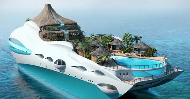 Avand o lungime de 90 m, iahtul arata exact ca o insula si are in componenta propria piscina, ski jeturi, sezlonguri si baldachine atat la suprafata, cat si o platforma cu toate utilitatile care se fixeaza pe mare sau pe ocean.