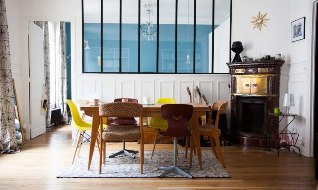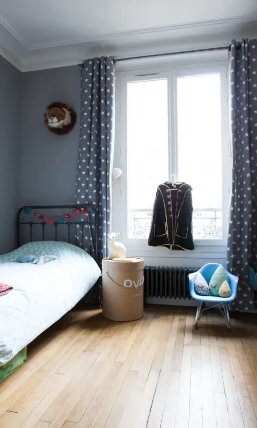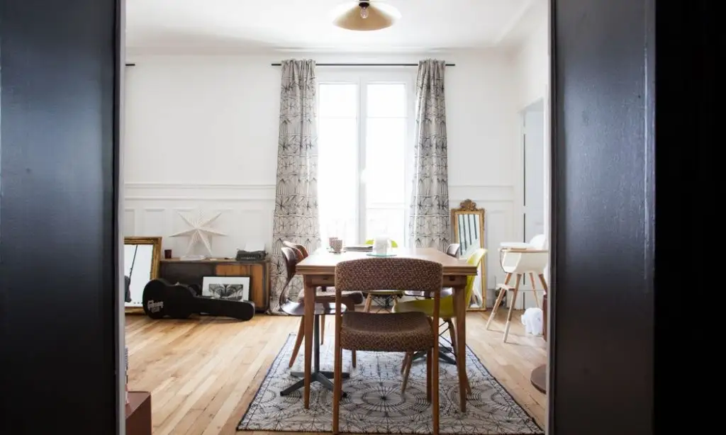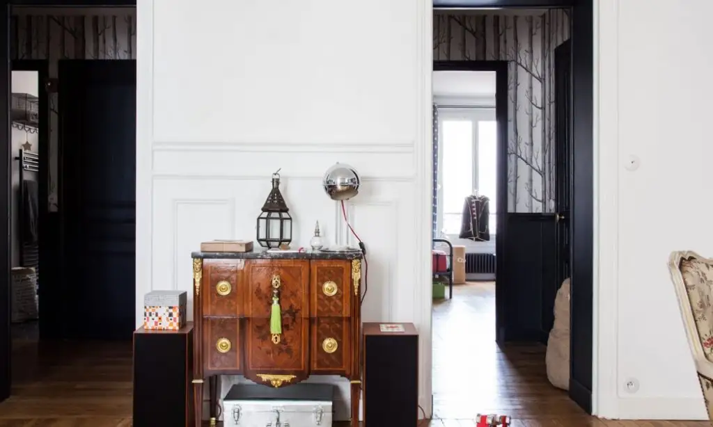 Proprietarii apartamentului, Thierry si Marie-Sophie, s-au ocupat personal de reproiectarea si amenajarea spatiului, de la podeaua din lemn natural la tavanul incrustrat cu motive de epoca. A fost nevoie de trei luni pentru renovarea totala a unui apartamentul neamenajat de patruzeci de ani.
