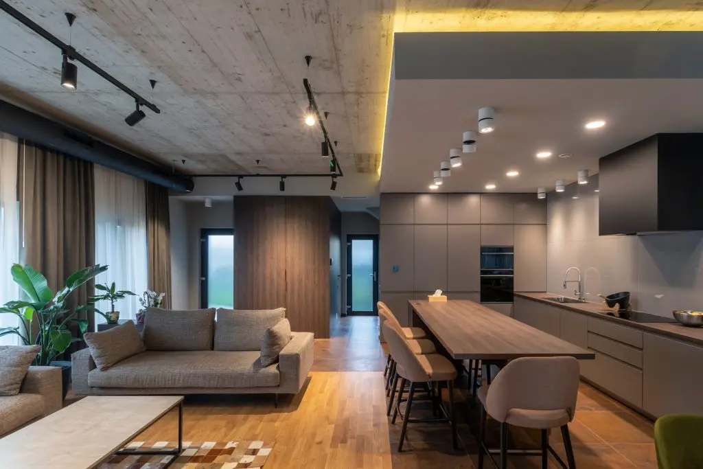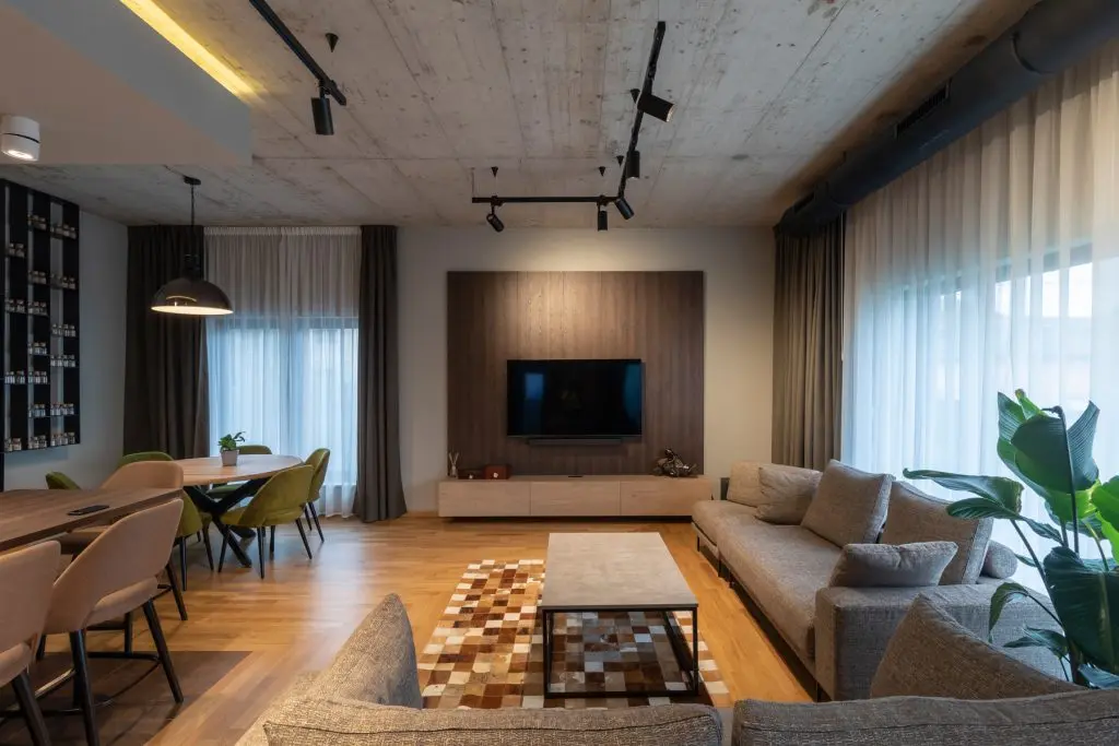 La nivel cromatic regasim multe tonuri de gri, specific stilului industrial, textura de beton, totul inobilat de lemnul in tonuri saturate (folosit la parchet si mobilier) si accentele de negru si crom.