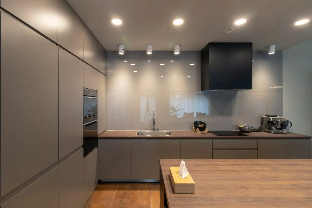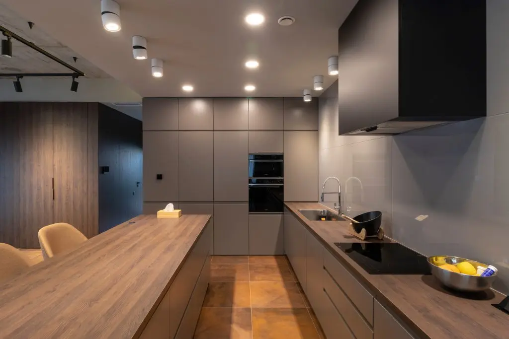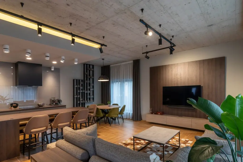 Arhitectii au optat pentru lumina calda in zona de zi, conturand o atmosfera placuta , primitoare, din diverse surse (lumina generala, spoturile reglabile si cele fixe de la bucatarie, sistemul liniar de spoturi din living, iluminatul de accent prin intermediul nisei cu banda led din zona de bucatarie).