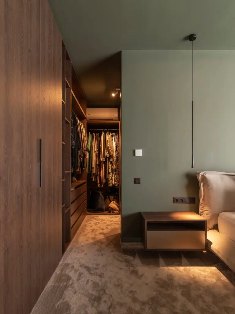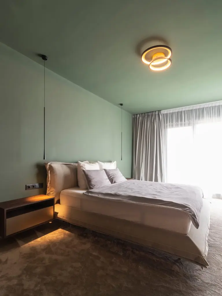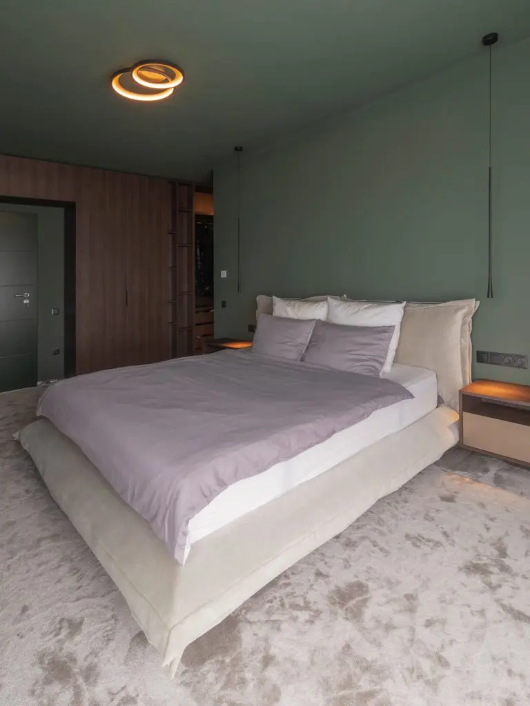 Dormitorul matrimonial, amplasat la etaj, continua expresia stilistica a zonei de zi, la care se adauga un pic mai mult rafinament si confort prin materialele si finisajele propuse de arhitecti. Nuanta uni, verde, a vopselei lavabile folosite la peretii si tavanul dormitorului confera un plus de eleganta camerei si muta accentul pe detaliile pieselor de mobilier.