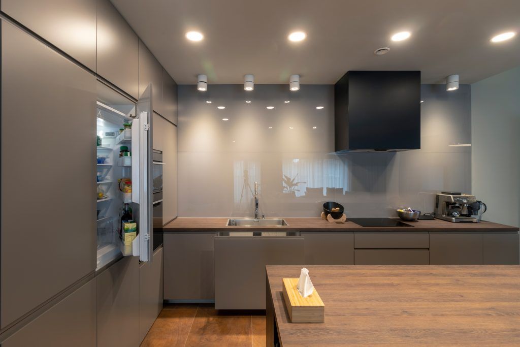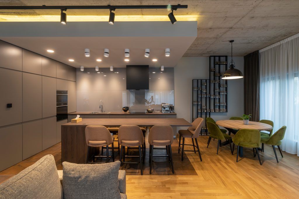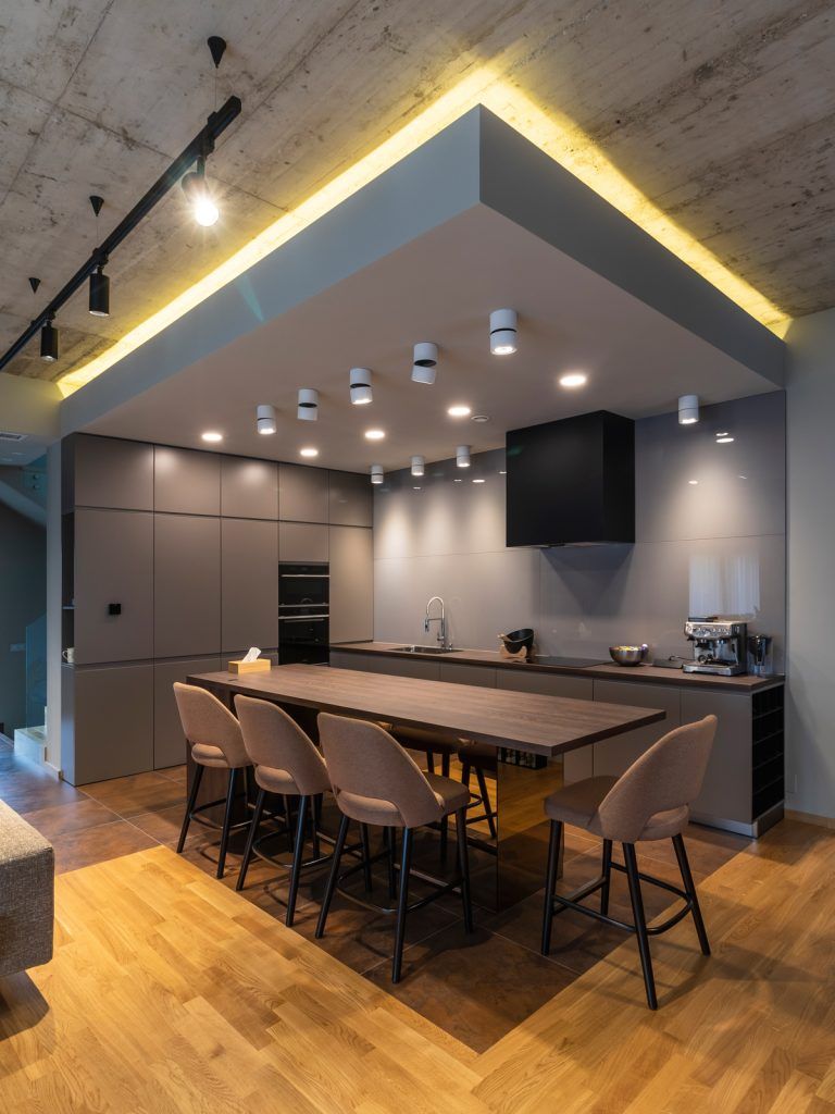 Arhitectii au optat pentru lumina calda in zona de zi, conturand o atmosfera placuta , primitoare, din diverse surse (lumina generala, spoturile reglabile si cele fixe de la bucatarie, sistemul liniar de spoturi din living, iluminatul de accent prin intermediul nisei cu banda led din zona de bucatarie).