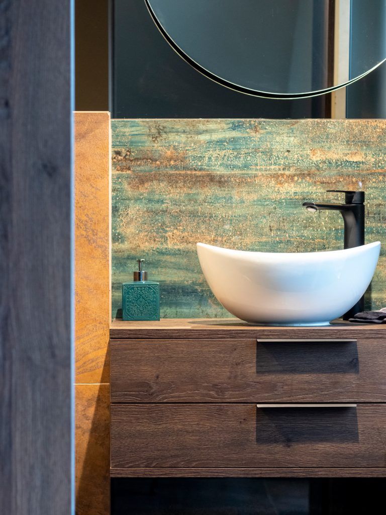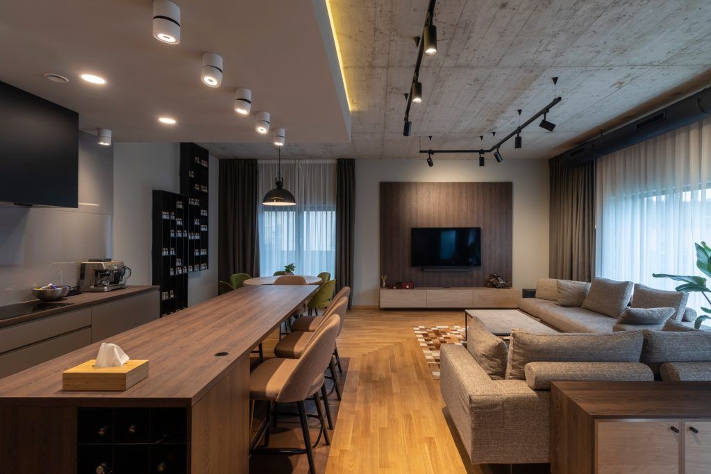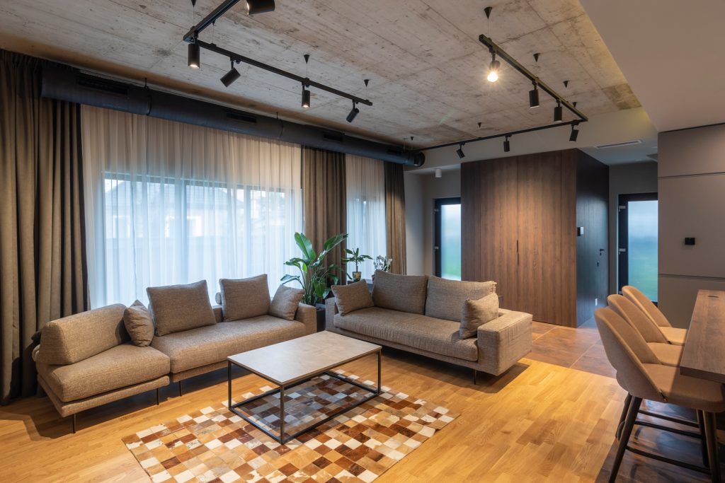 La nivel cromatic regasim multe tonuri de gri, specific stilului industrial, textura de beton, totul inobilat de lemnul in tonuri saturate (folosit la parchet si mobilier) si accentele de negru si crom.