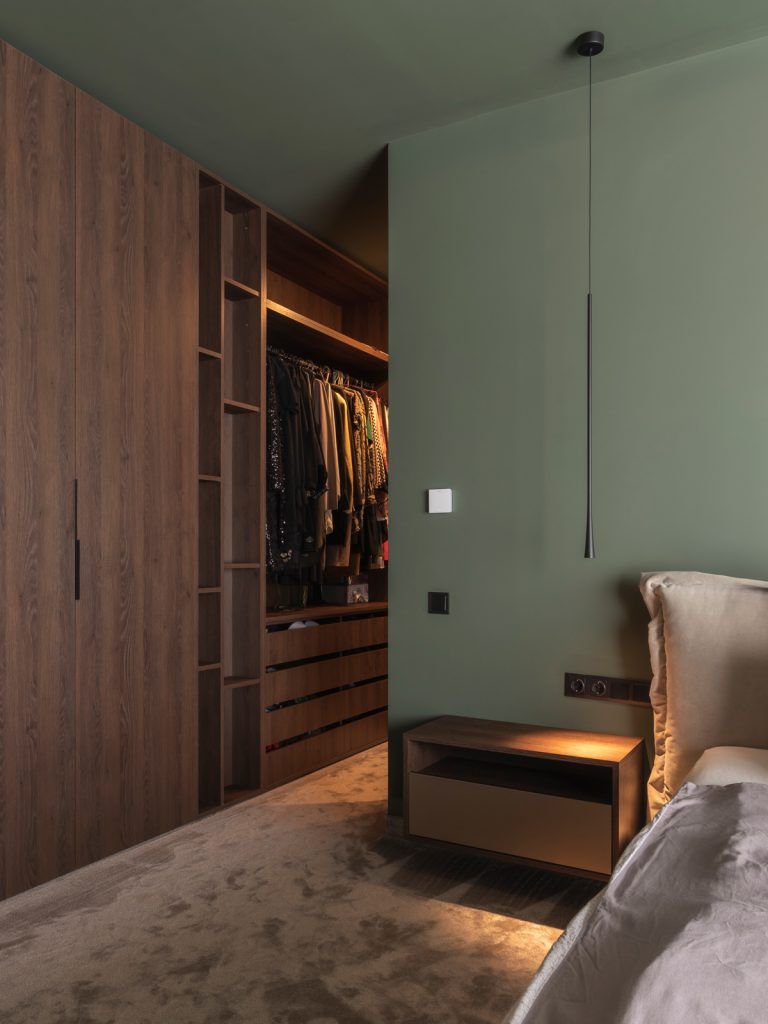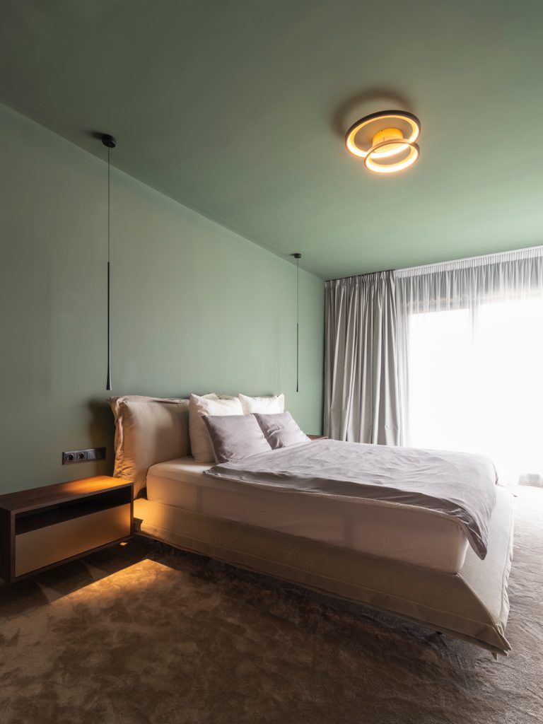 Dormitorul matrimonial, amplasat la etaj, continua expresia stilistica a zonei de zi, la care se adauga un pic mai mult rafinament si confort prin materialele si finisajele propuse de arhitecti. Nuanta uni, verde, a vopselei lavabile folosite la peretii si tavanul dormitorului confera un plus de eleganta camerei si muta accentul pe detaliile pieselor de mobilier.