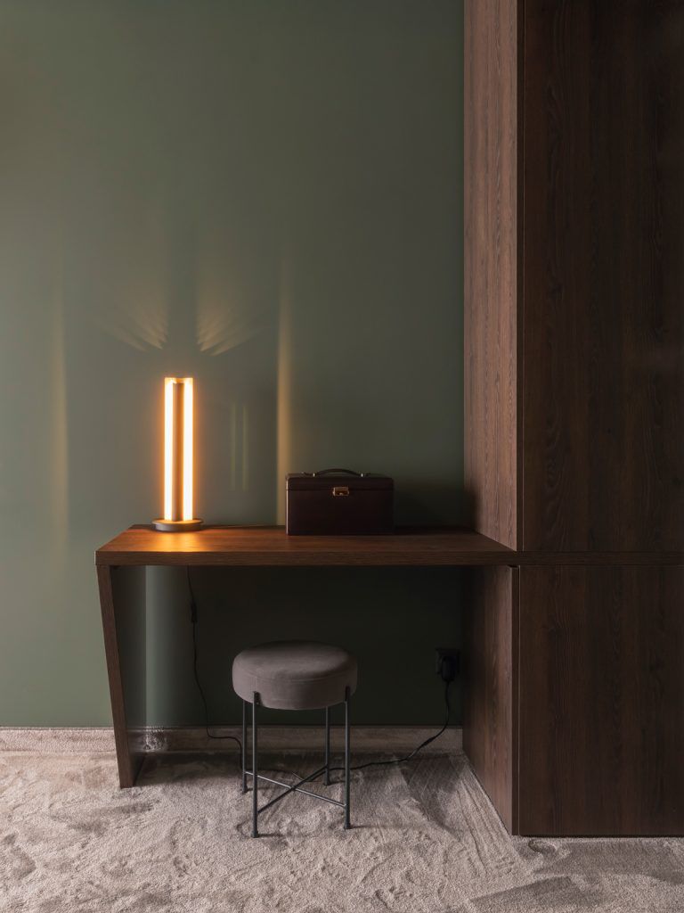 “Una dintre cerintele principale ale beneficiarilor a fost integrarea colectiei de nisipuri, pe care si-au dorit sa o vada in fiecare zi, aceasta reprezentand o amintire vie a tuturor locurilor vizitate in ultimii 15 ani.” Acest corp de mobilier a fost gandit ca un sistem de expunere, realizat din platbanda de aluminiu.