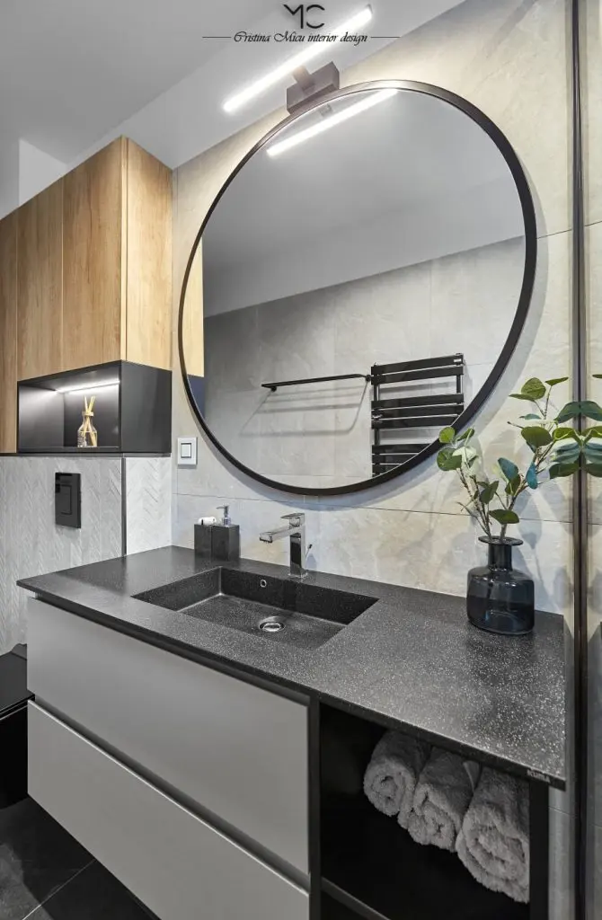“Baile au fost amenajate pentru el si pentru ea, in alb si negru, subliniind feminul si masculinul, in aceleasi note elegante. Dus walk-in, cada freestanding, placi ceramice de la Ragno, baterii aurii, toate imbinandu-se armonios.”
