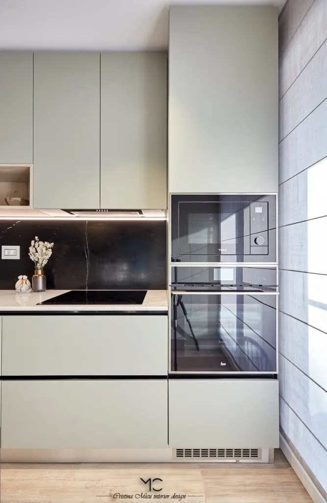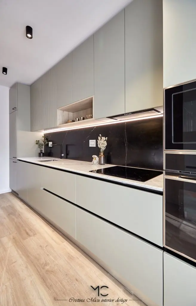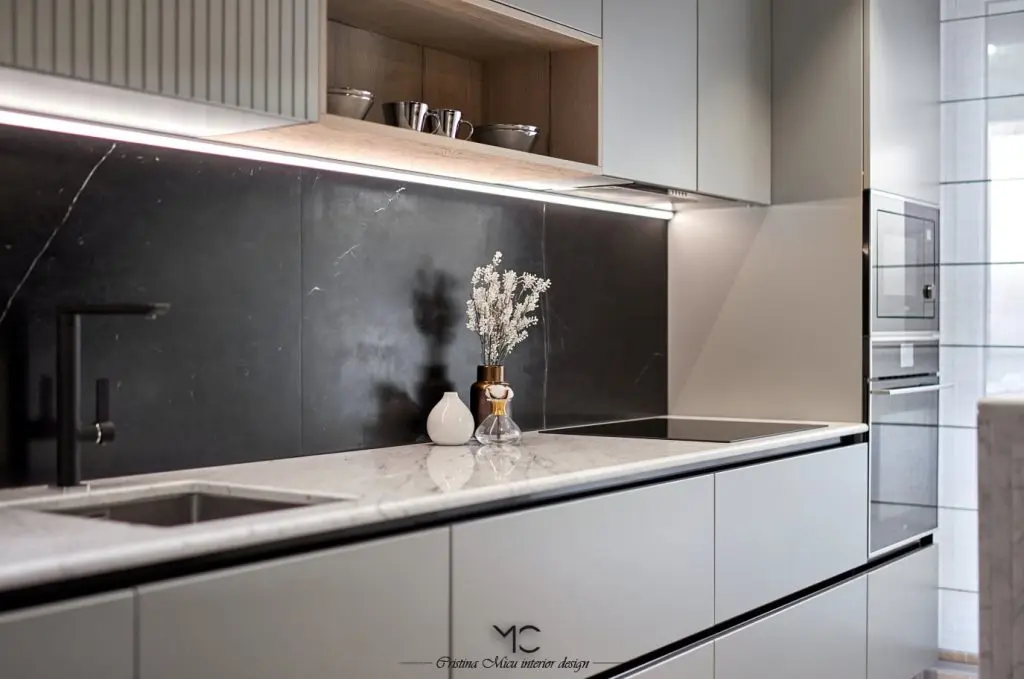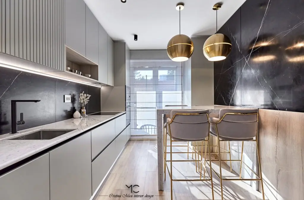 Bucataria este compact amenajata, predomina liniile minimaliste. La nivel de finisaje, accentul a fost pus pe valorificarea suprafetelor prin contrast. Astfel, mobilierul gri contrasteaza placut cu placarea cu marmura neagra a peretilor. Insertii de lemn si accente de auriu au fost incluse pentru a contura si mai bine atmosfera glam.Optiunea pentru electrocasnice negre, alese din gama Teka, pune in valoare blatul de marmura Calacatta.