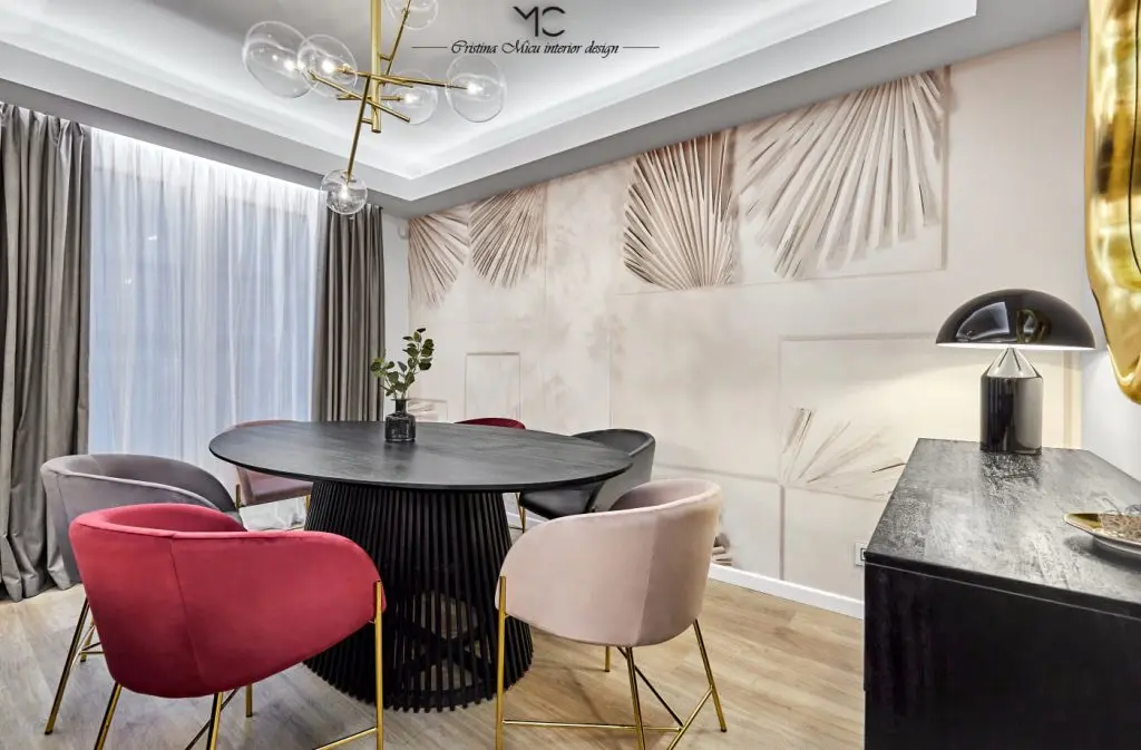 Diningul este tratat ca o extensie stilistica a zonei de living. Regasim un tapet interesant marca Glamora pe fundalul caruia se proiecteaza scaunele elegante, alese in nuante diferite de catifea.