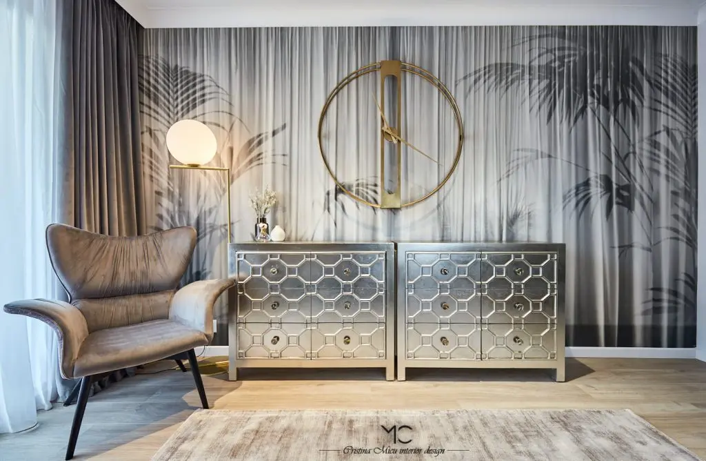 Stilul modern cu influente glam cu accente pretioase, aurii si argintii, defineste aceasta amenajare ce poarta amprenta arhitectei Cristina Micu.