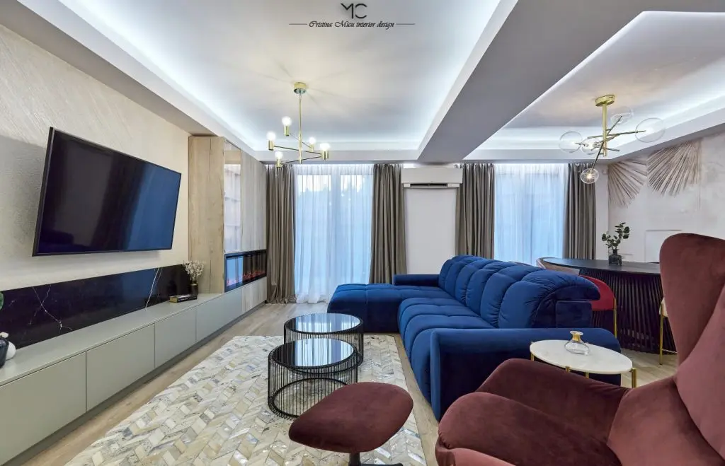 Canapeaua din catifea albastru intens si fotoliul rosu bordo contureaza un living modernsi impunator. Folosirea marmurei si amplasarea unui semineu in decorul livingului confera eleganta, relaxare si contribuie la creionarea acelui sentiment de “acasa”. Peretele accent a fost finisat cu o vopsea decorativa Murali Artwork.