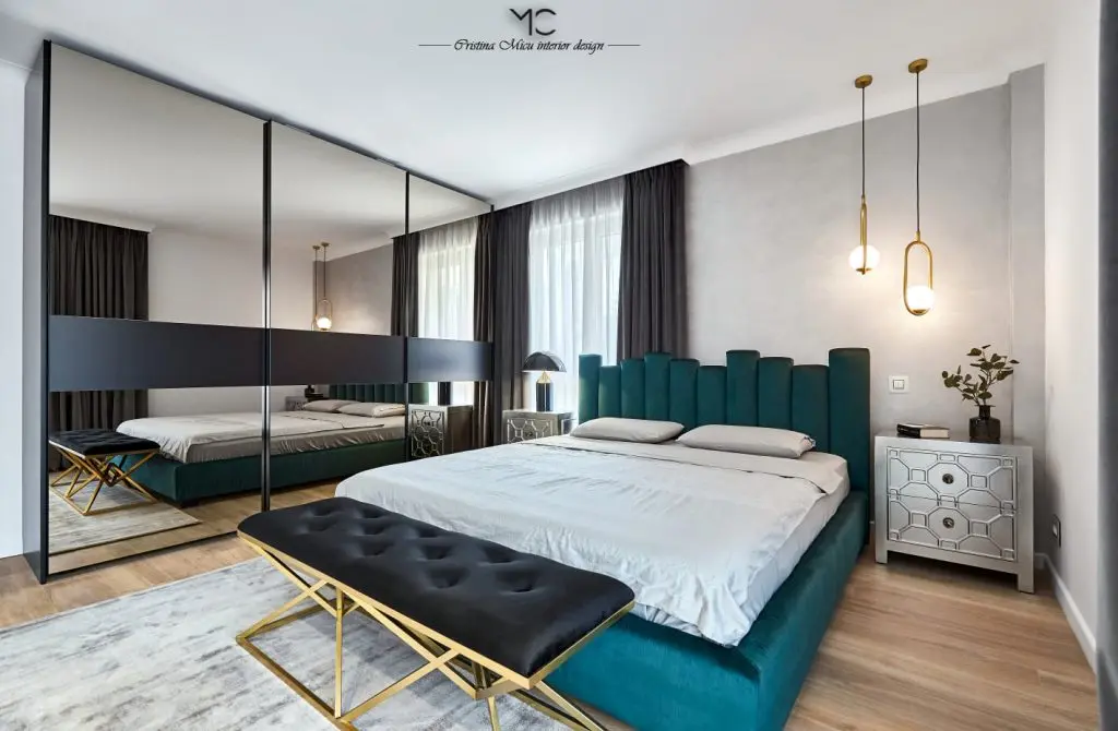 Dormitorul este un spatiu elegant, puternic iluminat natural, in care vedeta este patul tapitat cu catifea verde achizitionat de la Rovere Mobili. Oglinzile fumurii din dressing au rolul de a dubla vizual spatiul.