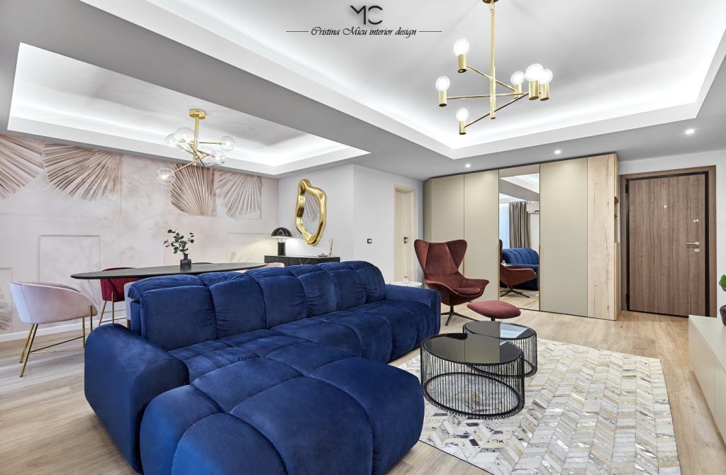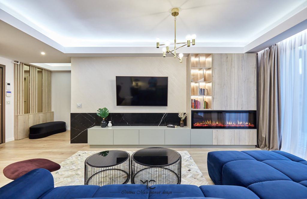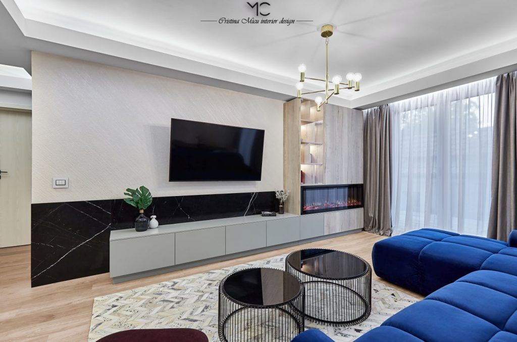 Canapeaua din catifea albastru intens si fotoliul rosu bordo contureaza un living modernsi impunator. Folosirea marmurei si amplasarea unui semineu in decorul livingului confera eleganta, relaxare si contribuie la creionarea acelui sentiment de “acasa”. Peretele accent a fost finisat cu o vopsea decorativa Murali Artwork.