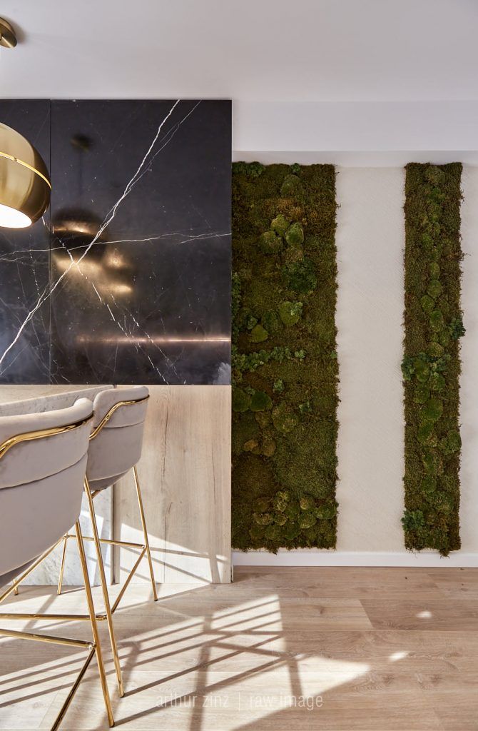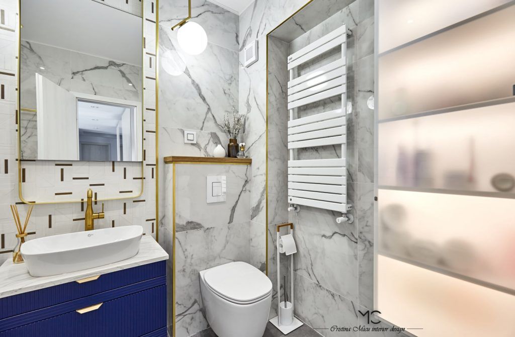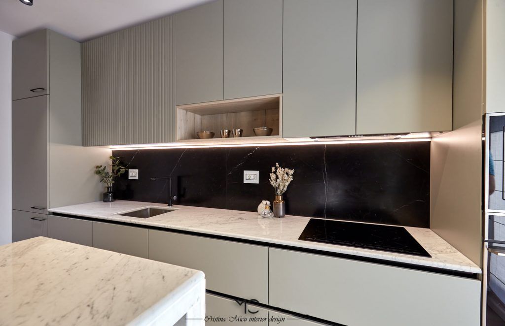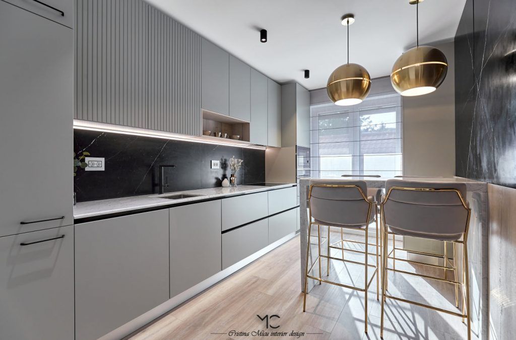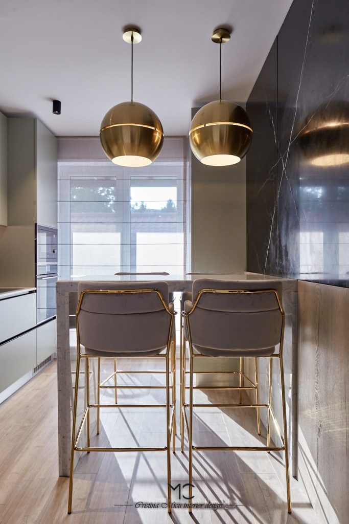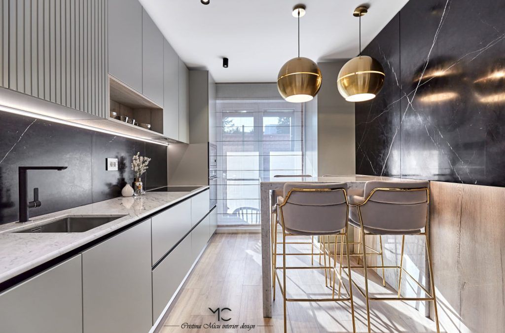 Bucataria este compact amenajata, predomina liniile minimaliste. La nivel de finisaje, accentul a fost pus pe valorificarea suprafetelor prin contrast. Astfel, mobilierul gri contrasteaza placut cu placarea cu marmura neagra a peretilor. Insertii de lemn si accente de auriu au fost incluse pentru a contura si mai bine atmosfera glam.Optiunea pentru electrocasnice negre, alese din gama Teka, pune in valoare blatul de marmura Calacatta.