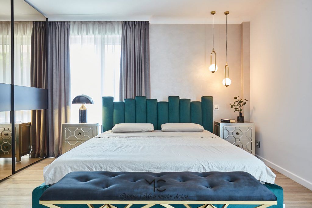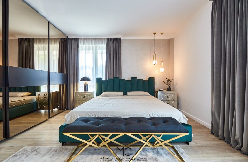 Dormitorul este un spatiu elegant, puternic iluminat natural, in care vedeta este patul tapitat cu catifea verde achizitionat de la Rovere Mobili. Oglinzile fumurii din dressing au rolul de a dubla vizual spatiul.