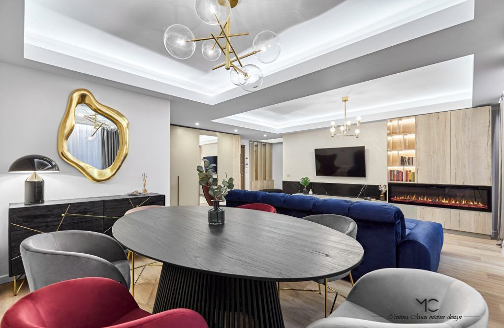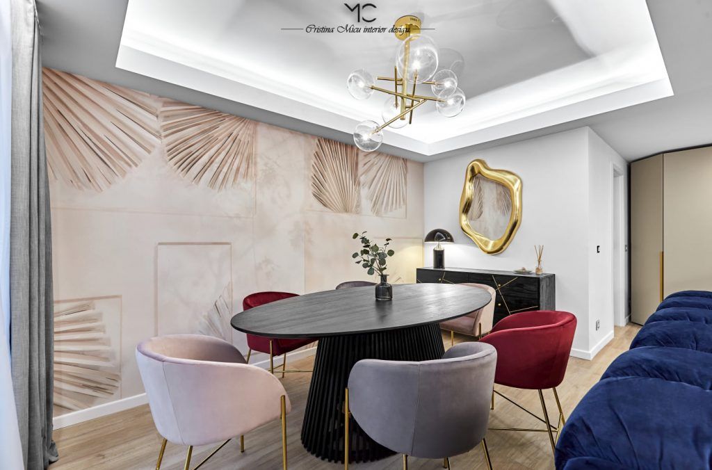 Diningul este tratat ca o extensie stilistica a zonei de living. Regasim un tapet interesant marca Glamora pe fundalul caruia se proiecteaza scaunele elegante, alese in nuante diferite de catifea.
