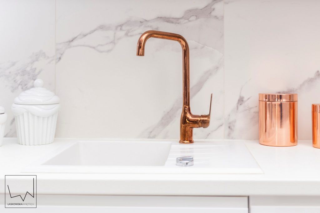 Pretiozitatea rozului auriu, cel care da tonul esteticii actuale, isi pune amprenta indeosebi in spatiul bucatariei si zonei de dining. In cazul locului de pregatire a mesei se opteaza pentru un mobilier alb lucios, cu design minimalist, lipsit de manere, care contrasteaza perfect cu rozul auriu al bateriei si restul accesorilor metalice.