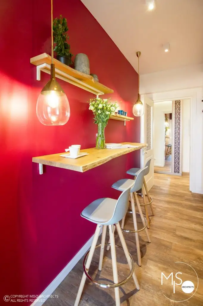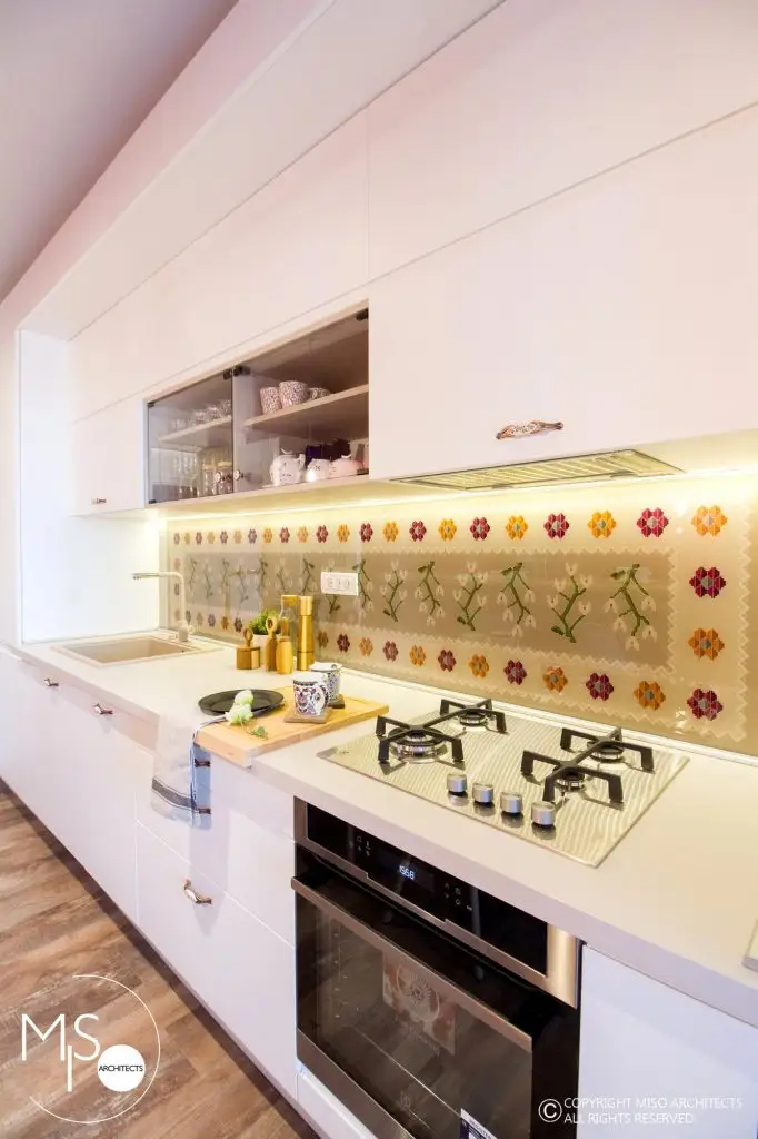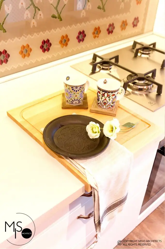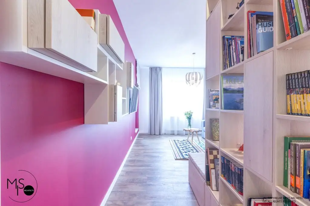 Paleta cromatica curajoasa contrasteaza armonios cu motivele traditionale romanesti inserate in decorul modern. Regasim astfel covorul oltenesc imprimat pe sticla de la backsplashul bucatariei, covorul cu anumite elemente stilizate, frezajele fetelor de usi din camera, micile accesorii din biblioteca.