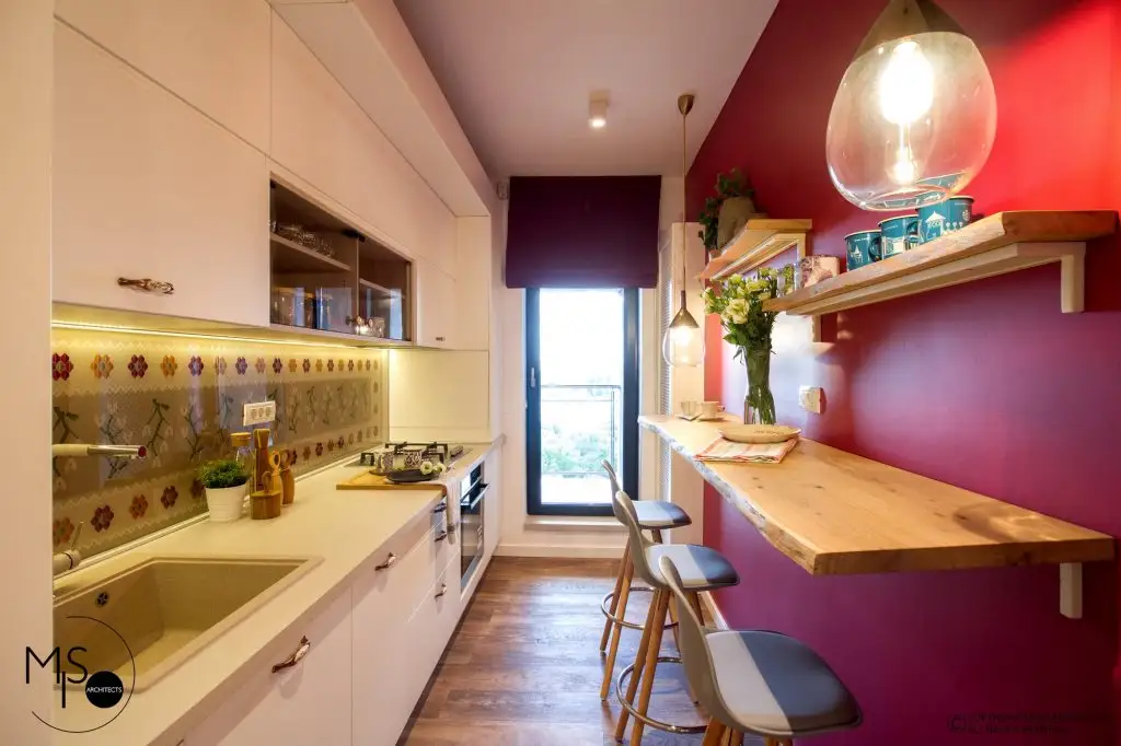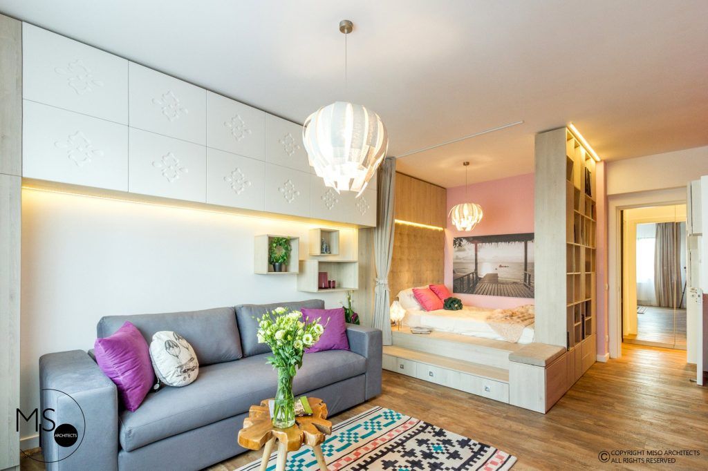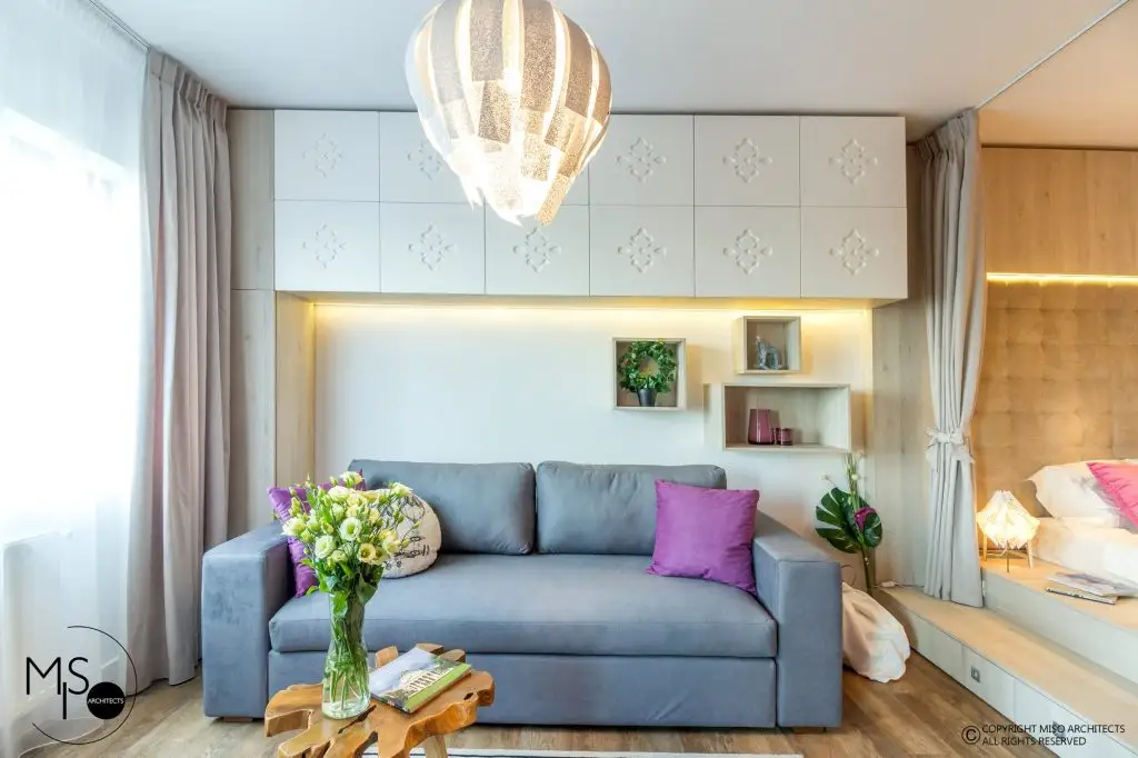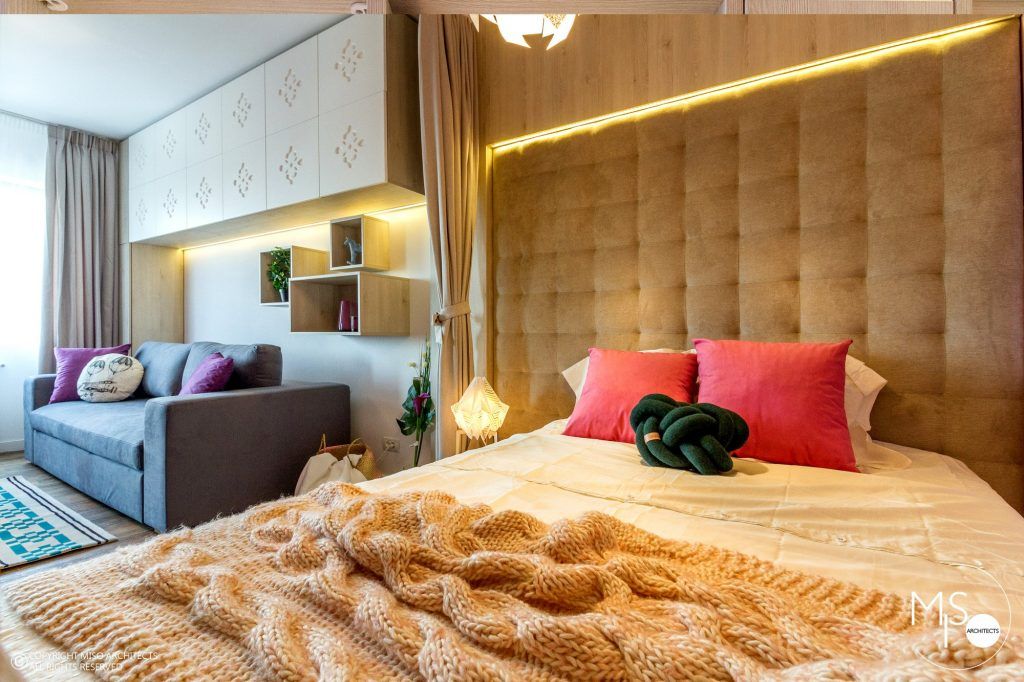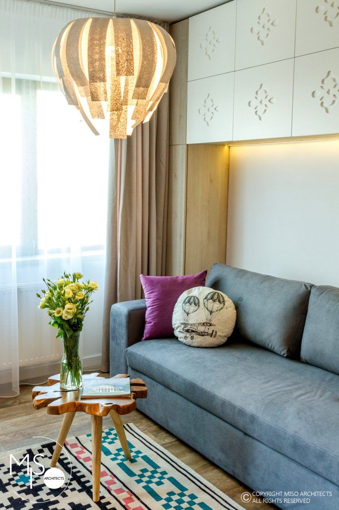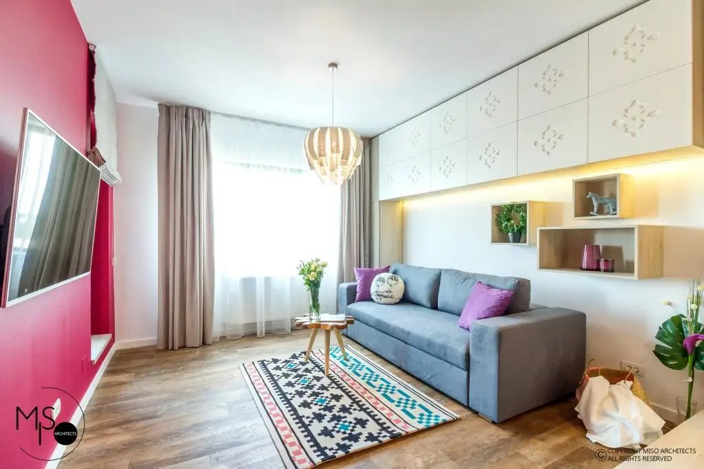 Amenajat pentru o tanara care lucreaza in afara tarii si vine ocazional in vizita, studioului iese in evidenta prin imbinarea curajoasa a stilului modern cu elemente traditionale romanesti si accente de culori saturate, puternice. Este amplasat intr-un complex rezidential din Bucuresti si dispune de doar 41 de metri patrati utili plus 3 metri patrati de terasa.