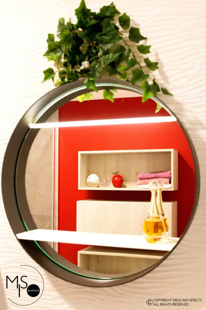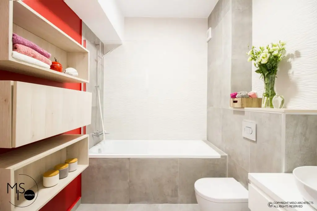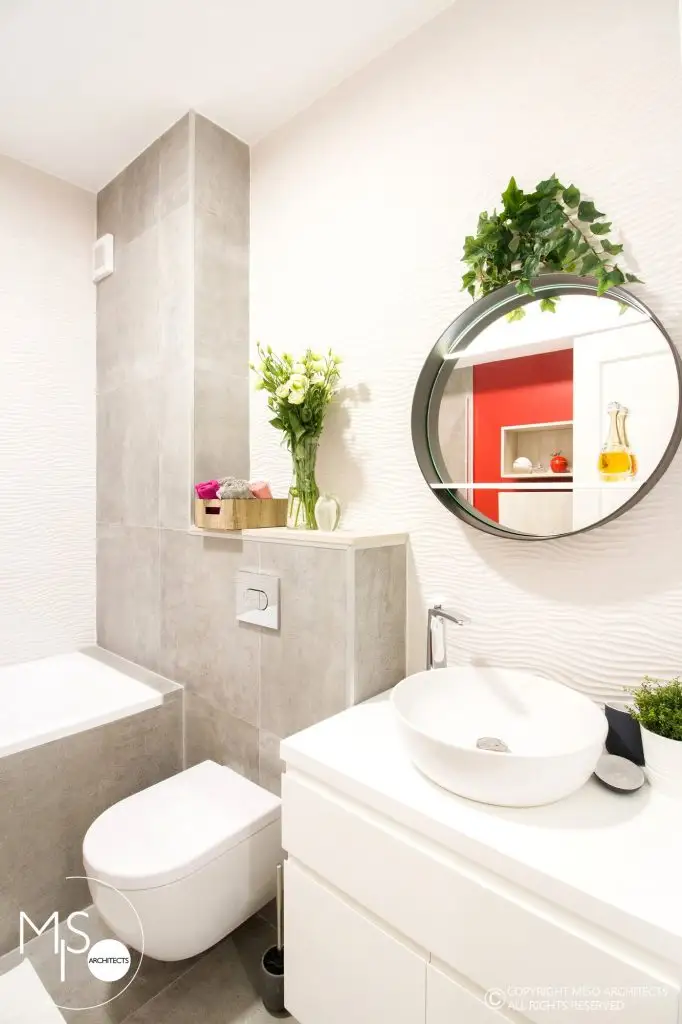 Baia a fost placata cu gresie si faianta marca Porcelanosa, fiind spatiul cel mai modern si neutru al locuintei. Peretii sunt finisati cu vopsea lavabila Benjamin Moore, mata.
