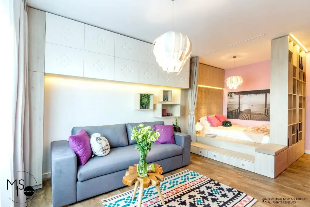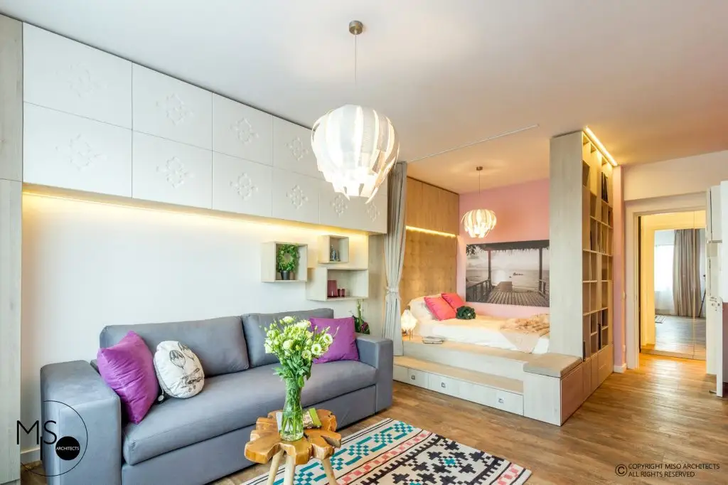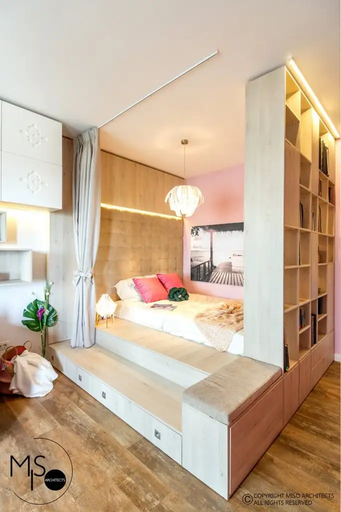 Camera a fost delimitata in doua zone, conturand astfel spatiul de zi cu acces catre terasa si un spatiu de noapte, creat printr-un ansamblu ingenios (pat-sertare-biblioteca) finisat intr-o nuanta de pin alb. Structura pe care a fost amplasata salteaua se continua cu un podest cu sertare si o bancheta catre hol.