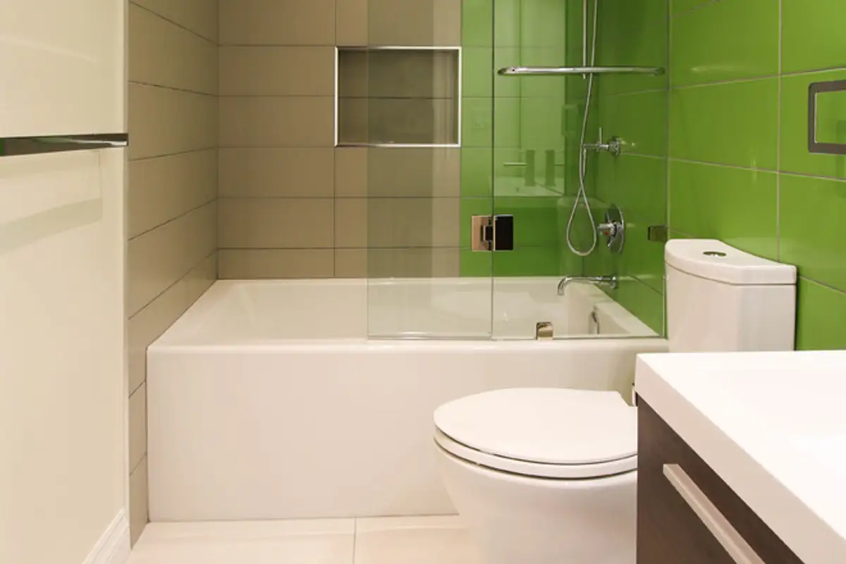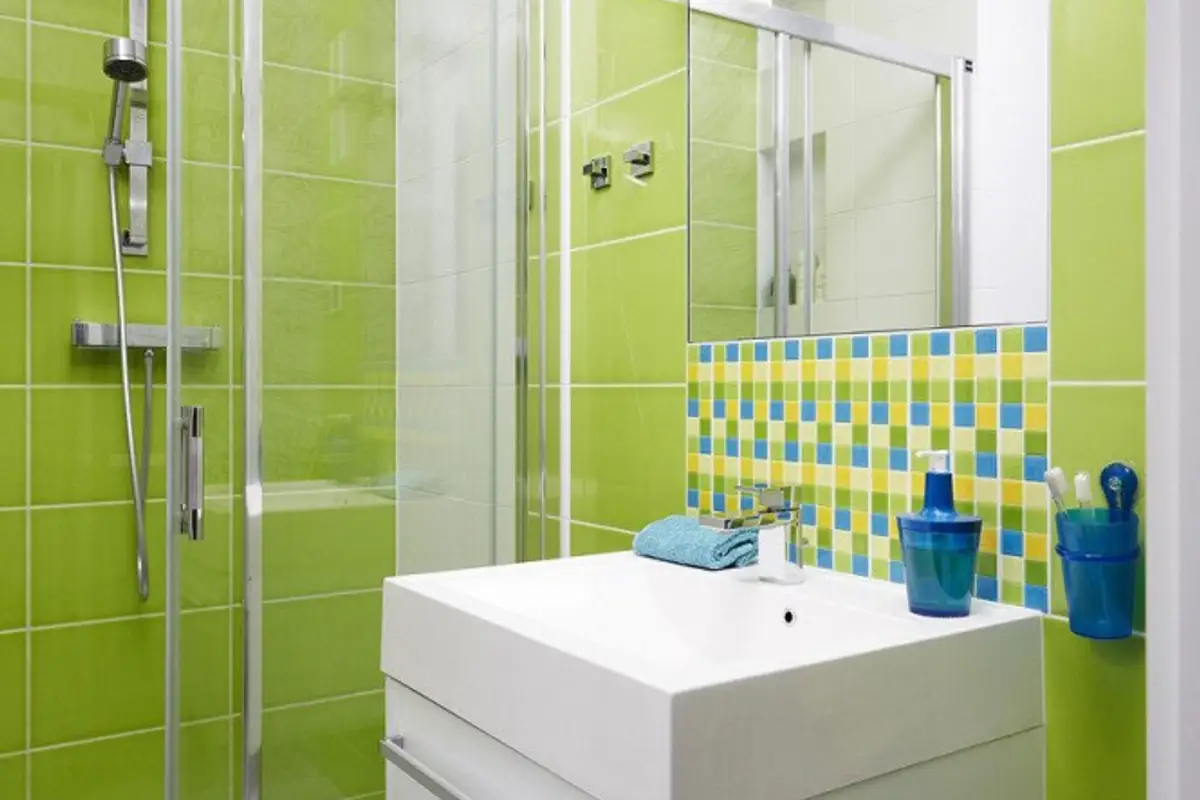 For a bolder decor, you can choose a black cabinet and accents of bright green to create a tile pattern; the exterior of the bathtub can also be green for an extra effect.