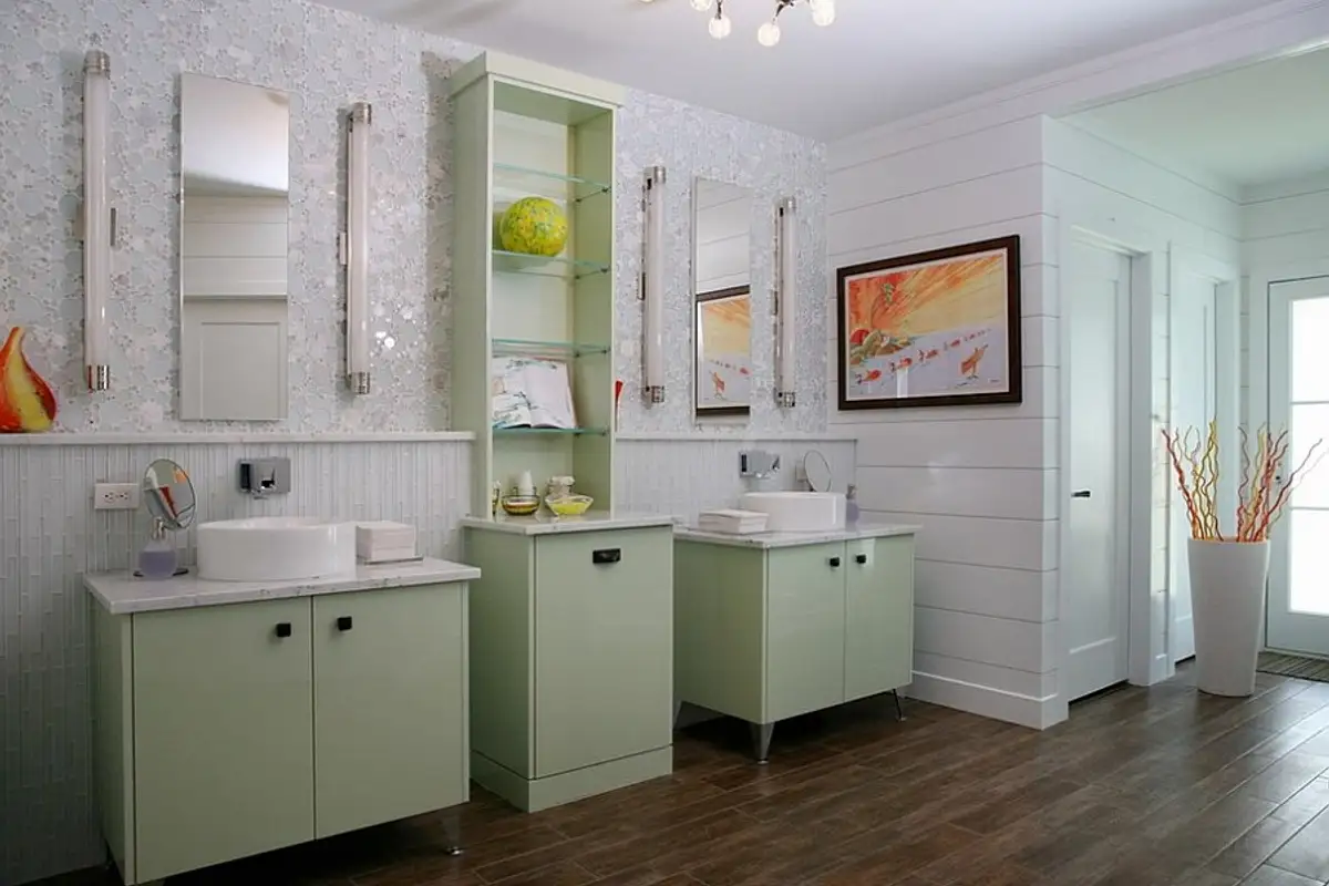 A "gentle" pairing is mint green and white. We recommend this especially for small and narrow bathrooms. Use white for the walls and green for the cabinet under the sink and the cabinet where you store various bathroom items.