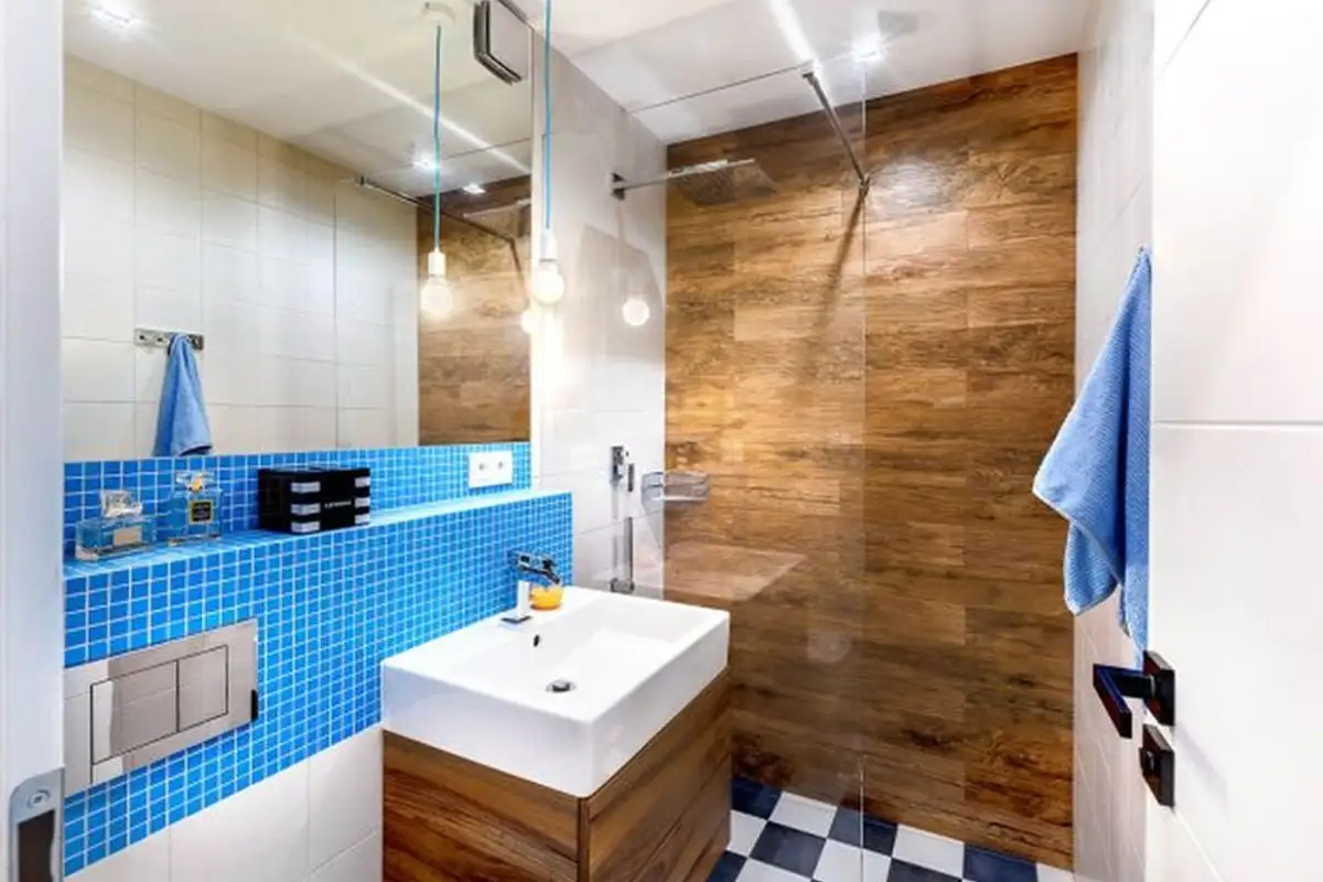 Pay due attention to lighting! You can opt for some spotlights in the ceiling to provide general lighting and then strong lighting near the mirror for better visibility. If your bathroom has a window, then allow natural light to penetrate the room. Don't block it with a shower curtain, but choose a transparent glass partition instead.