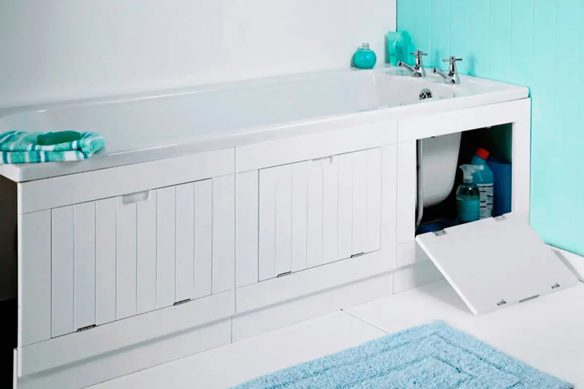 Every centimeter counts in a small bathroom. Solutions can be found even where you don't expect them: what do you think about storage spaces right under the bathtub? (see image in photo gallery)
